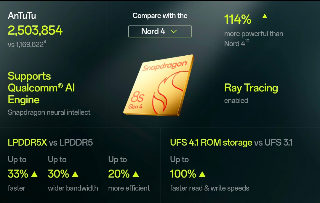 ชิปประมวลผล Snapdragon 8s Gen 4 หน่วยความจำแบบ LPDDR5X กับ UFS 4.1 มีคะแนนทดสอบประสิทธิภาพสูงหลัก 2 ล้าน ประสิทธิภาพโดยรวมสูงกว่าเดิม 114% เมื่อเทียบกับรุ่น Nord 4