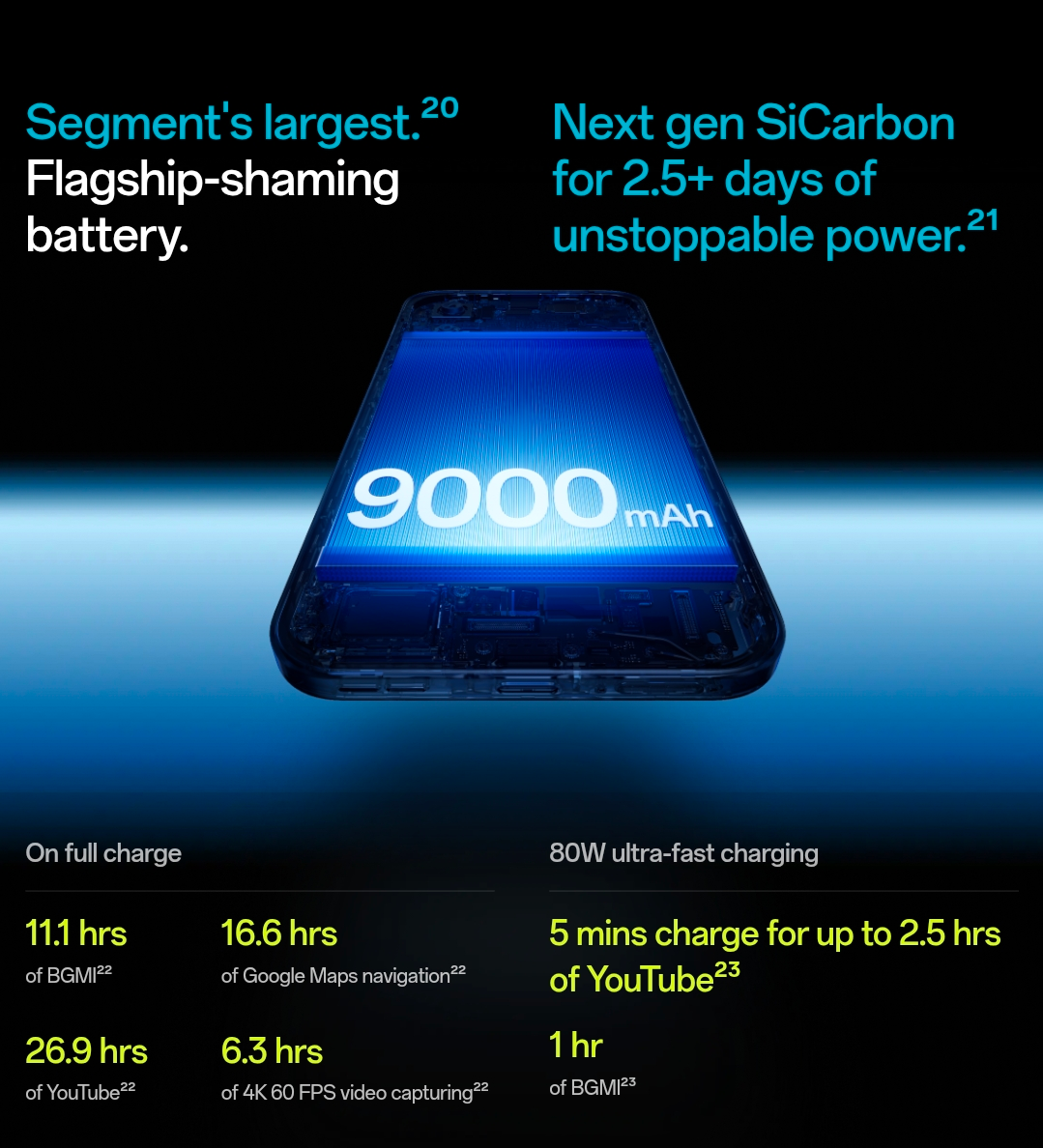 แบตเตอรี่ความจุ 9,000mAh ชาร์จเร็ว 80W ชาร์จย้อนกลับผ่านสาย 27W และเทคโนโลยีบายพาสชาร์จ ลำโพงคู่ระบบสเตอริโอเสียงรอบทิศทาง 3D audio localization มีชิป G2 ช่วยให้การเชื่อมต่อ Wi-Fi หรือ 5G เสถียรมากกว่าเดิม ระยะการจับสัญญาณกว้างยิ่งขึ้น