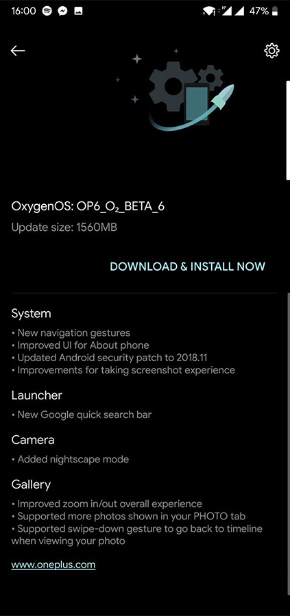 ถ้าใครได้ลองอัพเดต Open Beta ตัวก่อนหน้า สามารถอัพเดตเวอร์ชั่นล่าสุดผ่าน OTA ได้เลย ตอนนี้ตัวอัพเดตนั้นเป็นส่วนนึงของ OxygenOS แล้ว ซึ่งจะได้ OnePlus Launcher ใหม่ที่เปิดใช้งาน Quick Switch Gesture ได้ด้วย เราไม่จำเป็นต้องดาวน์โหลด APK จากข้างนอกมาติดตั้งเพิ่ม และยังมีฟีเจอร์กล้องถ่ายภาพในที่แสงน้อยอย่าง Nightscape ที่เพิ่งเปิดตัวไปให้ผู้ใช้งาน OnePlus 6 ด้วย