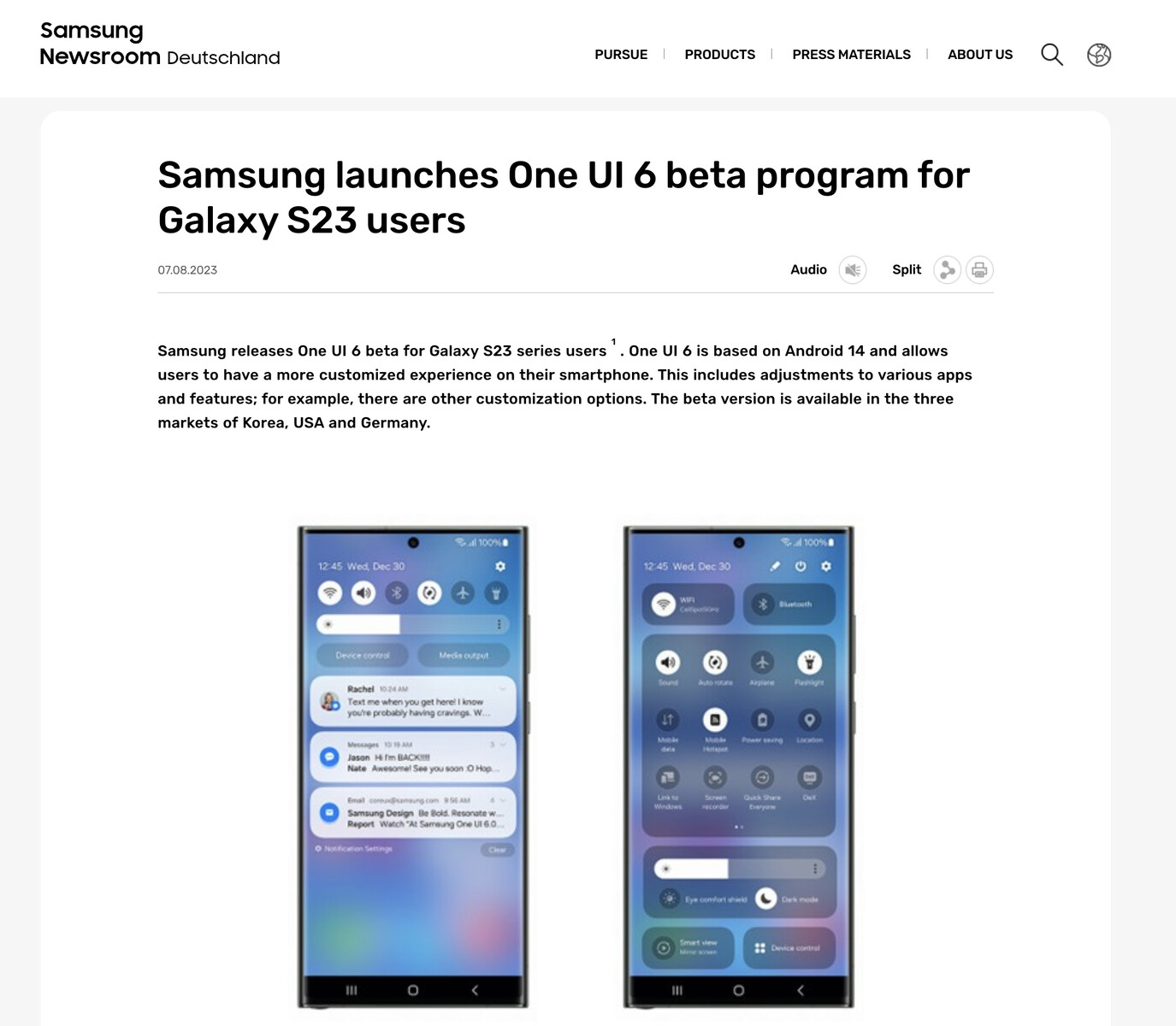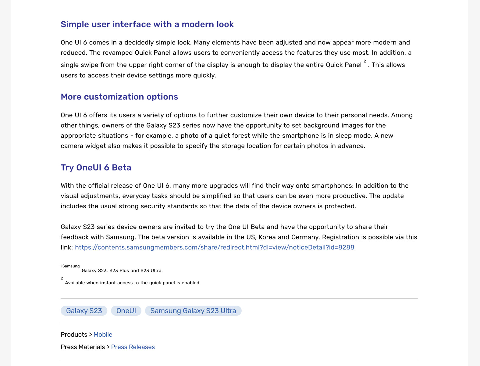 One UI 6 ที่มาพร้อมกับ Android 14 เตรียมเปิดให้อัปเดตกันแล้วในเร็ว ๆ นี้ Samsung ประเทศเยอรมนีหลุดหน้าข่าวประชาสัมพันธ์ (Press Release) ให้ผู้ใช้งานเข้าไปลงทะเบียนเพื่อร่วมทดสอบ One UI 6 Public Beta กันแล้ว แต่หน้าเว็บก็อยู่ได้แปปเดียว และโดนเก็บเป็นที่เรียบร้อย ซึ่งในนั้นก็มีหน้าตา UI ใหม่ พร้อมเผยฟีเจอร์คร่าว ๆ ให้ทราบกันแล้วด้วย