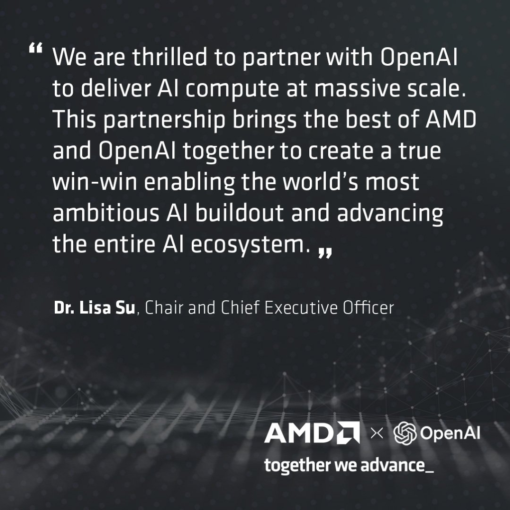 Sam Altman ซีอีโอของ OpenAI กล่าวถึงดีลนี้ว่า “ความร่วมมือนี้เป็นก้าวสำคัญในการสร้างพลังประมวลผลระดับโลก เพื่อให้ AI สามารถก้าวไปถึงศักยภาพสูงสุดได้เร็วขึ้น” ขณะที่ Lisa Su จาก AMD เสริมว่า “การร่วมมือกันครั้งนี้จะนำสิ่งที่ดีที่สุดของทั้งสองบริษัทมารวมกัน เพื่อสร้างโครงสร้างพื้นฐาน AI ที่ยิ่งใหญ่ที่สุดในโลก”
