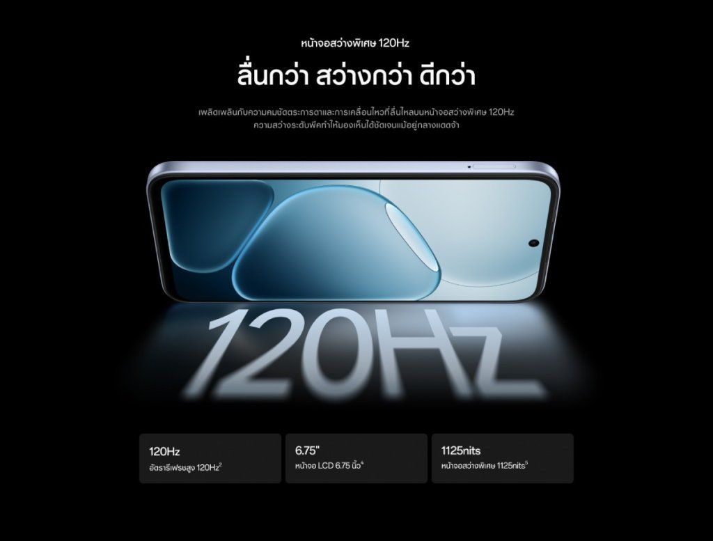 หน้าจอสว่างพิเศษ 120Hz ขนาด 6.75 นิ้ว พาเนลหน้าจอ LCD ความส่วางสูงสุด 1,125 นิต ความละเอียด HD+ ลำโพงสเตอริโอคู่ รองรับโหมด Ultra Volume 300% เสียงเกม เสียงเพลงหรือเสียงสนทนาก็ได้ยินแบบชัดเจน