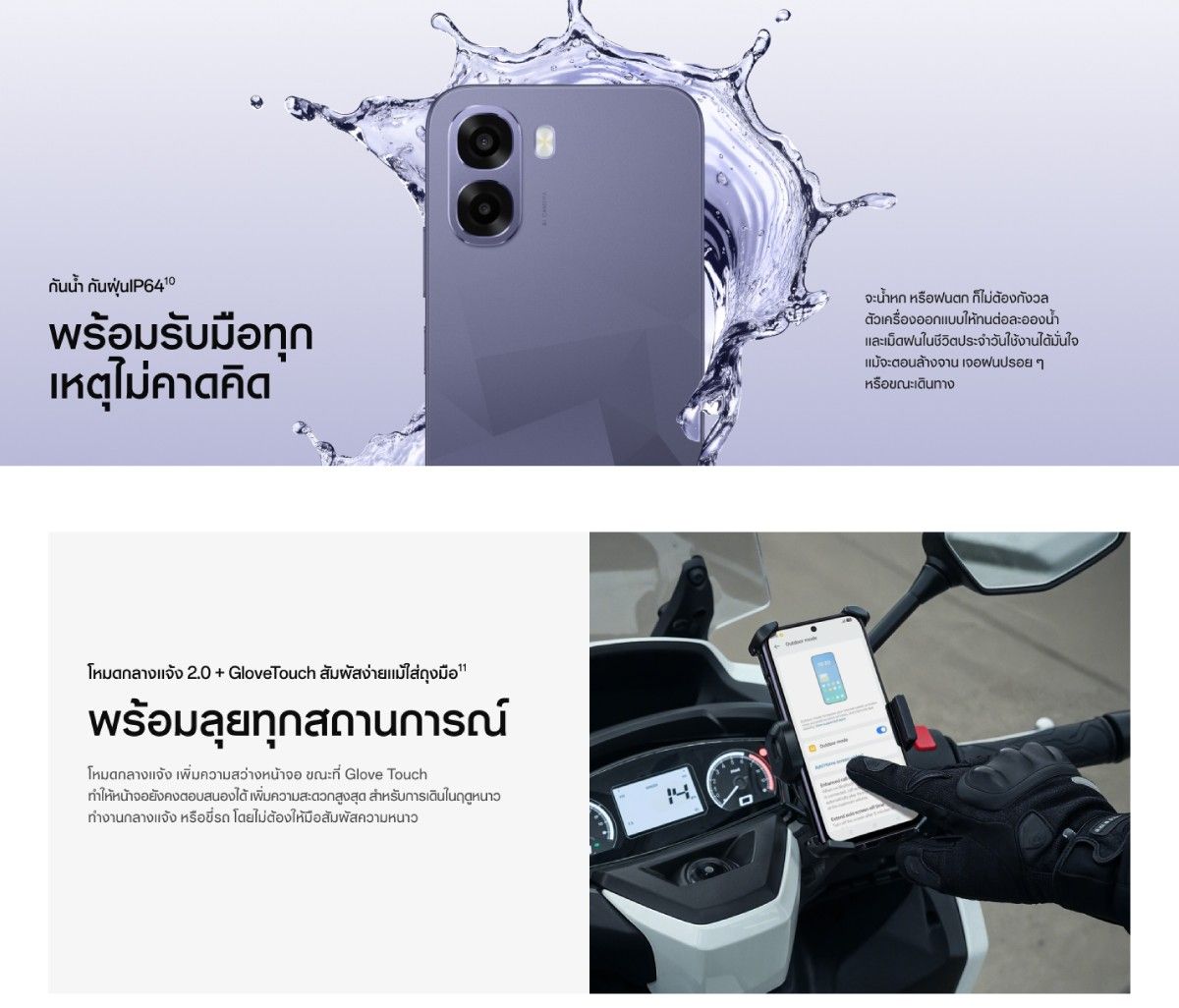 น้องเล็กสุดอย่าง OPPO A6t ก็จัดเต็มด้านสเปคไม่แพ้กัน หน้าจอ LCD ขนาด 6.75 นิ้ว 120Hz สว่างสู้แดด 1,125 นิต มีฟีเจอร์เหมาะกับพี่ไรเดอร์อย่าง Glove Touch ที่ทำให้หน้าจอยังสัมผัสได้ตามปกติแม้จะใส่ถุงมือ และ Splash Touch แม้มือจะเปียกก็ใช้งานหน้าจอได้