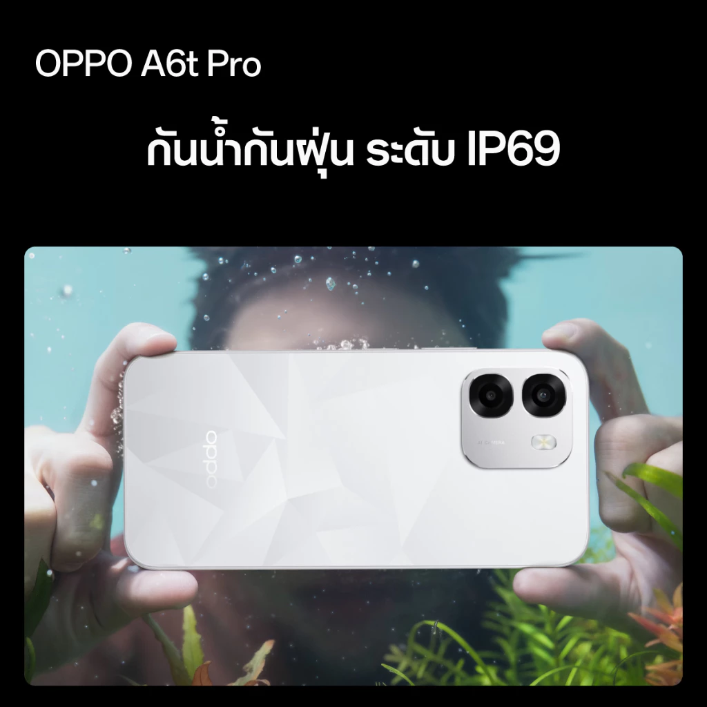 ในราคา 6,499 บาท OPPO A6t Pro มอบสเปคจัดเต็มสำหรับสายลุยมาให้โดยเฉพาะ มาตรฐานการกันน้ำ กันฝุ่น IP69 ทนน้ำลึกระดับ 1.5 เมตร ได้นาน 30 นาที รองรับการถ่ายภาพนิ่งหรือวิดีโอใต้น้ำ