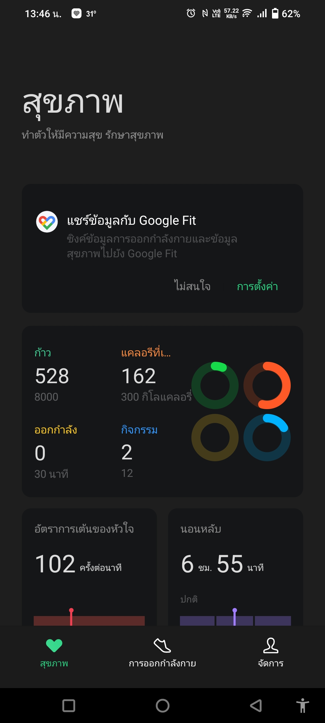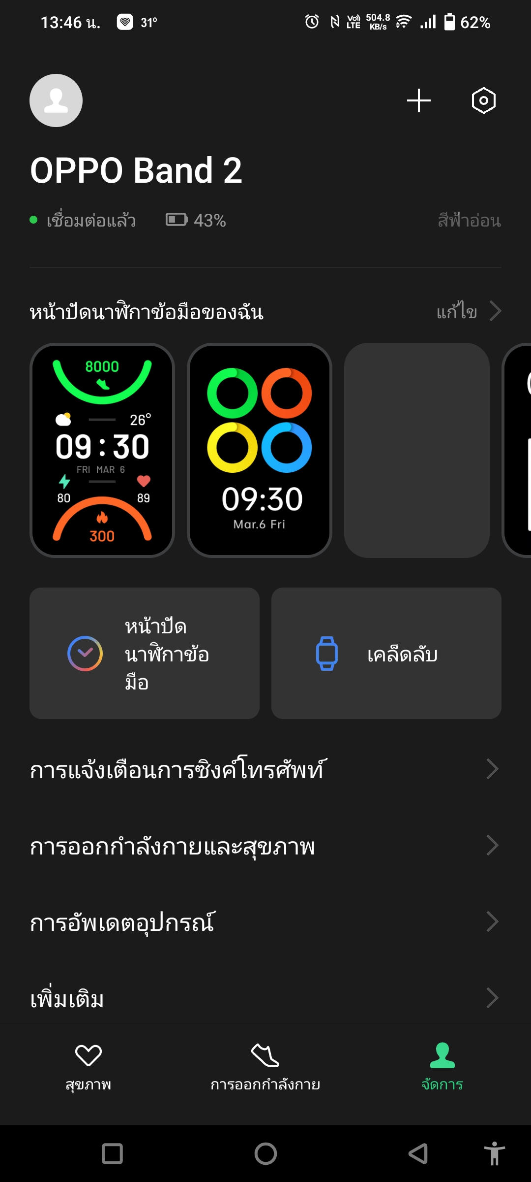 เรายังเข้าไปตั้งค่าพวกจุดมุ่งหมายในการออกกำลังต่าง ๆ ได้ในแอปนี้ด้วย เข้าไปที่เมนู จัดการ > การออกกำลังกายและสุขภาพ และลองปรับดูให้เหมาะกับตัวเองได้ ไม่ว่าจะเป็น เป้าหมายจำนวนก้าวในแต่ละวัน, การเผาผลาญแคลอรี่แต่ละวัน, แจ้งเตือนหากหัวใจเต้นแรงเกินไปขณะออกกำลัง หรือตรวจจับการออกกำลังอัตโนมัติ
