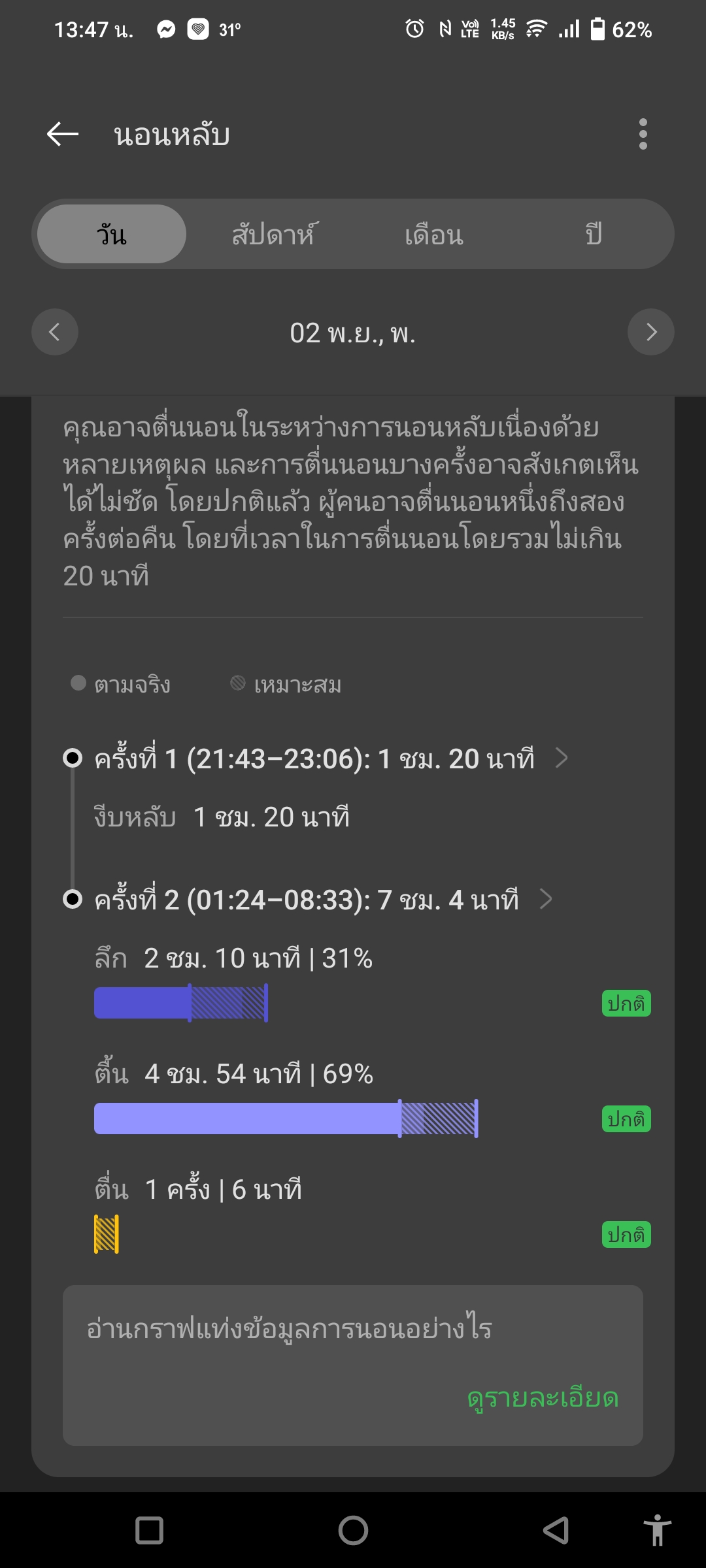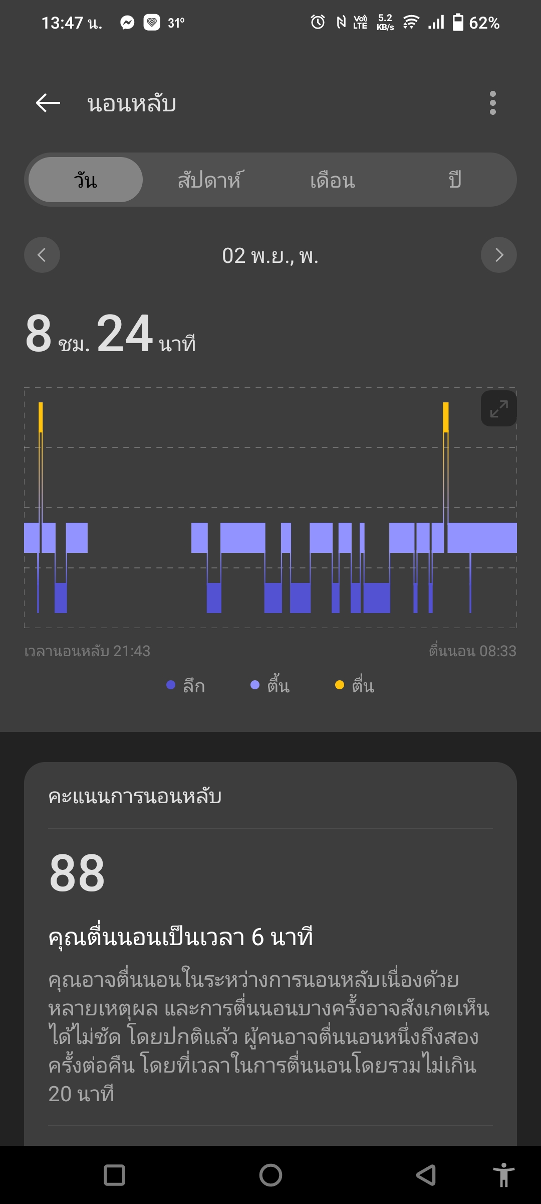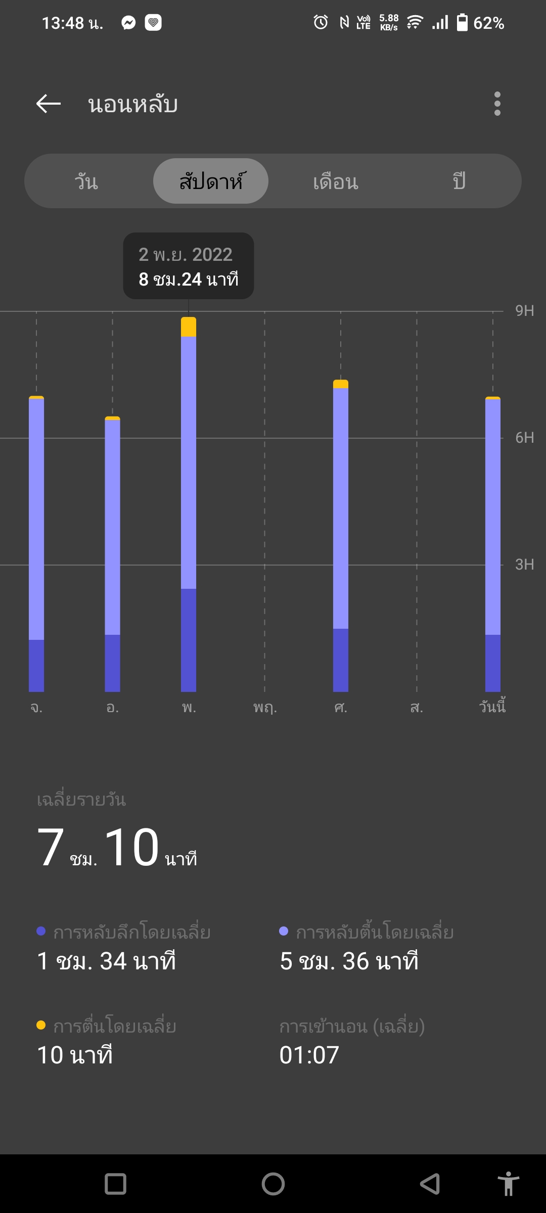 ในหน้าปัดขวานี้ยังรวมการวัดค่าอื่น ๆ ไว้ด้วย เช่น ความเครียด อัตราการเต้นหัวใจ (เลือกเข้าได้ 2 ทาง) และวัดคุณภาพการนอน ซึ่งไม่ต้องทำอะไรเลยแค่ใส่ OPPO Band 2 แล้วเข้านอนเท่านั้นแหละ พอตื่นมามันก็จะบอกข้อมูลว่าเรานอนไปกี่ชั่วโมง หลับลึก-หลับตื้นกี่ ชม. และยังมีข้อมูลเฉลี่ยเป็นสัปดาห์ – เป็นปี ให้ดูด้วยว่าปกติเรานอนเป็นยังไงบ้าง