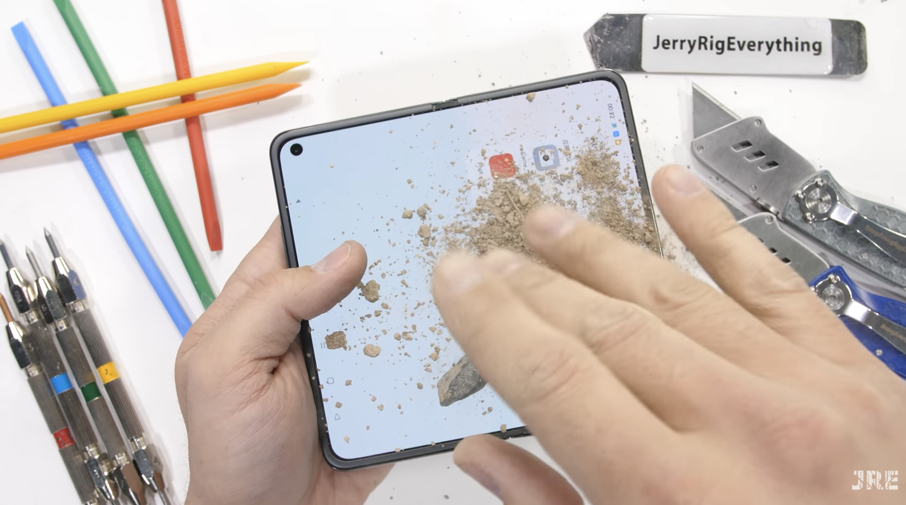 OPPO Find N สามารถรับมือกับบททดสอบเอาหินทรายกรวดมาเทใส่ตัวเครื่องได้เป็นอย่างดี บานพับยังคงทำงานได้ดีตามปกติ จะมีก็แต่หน้าจอด้านในที่แอบมีรอยขีดข่วนเพิ่มขึ้นมานิดนึง