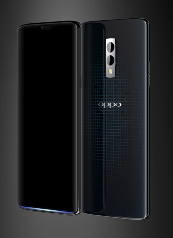 ส่วนภาพเรนเดอร์อีกชุดนึงนั้นด้านหน้าตัวเครื่องมีความคล้ายกับภาพหลุดชุดแรก จุดเด่นคือแถบสีฟ้าด้านล่าง ถ้าใครจำได้ทาง OPPO เคยใช้แถบแสงนี้ในมือถืออย่าง OPPO N3 และ OPPO Find 7 ที่เรียกว่า Skyline Notification ส่วนความโค้งด้านหลังและเงาสะท้อนบนกระจกนั้น ทำเอาอดนึกถึง OnePlus 6 ไม่ได้