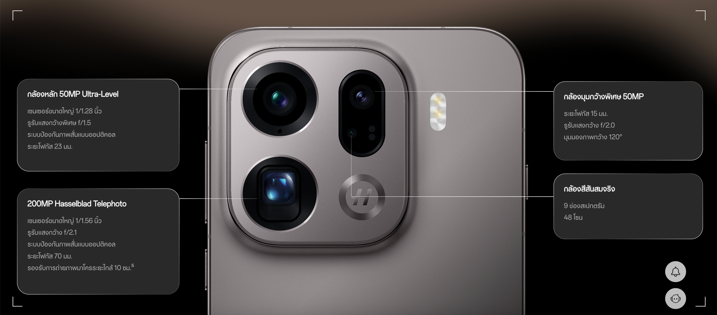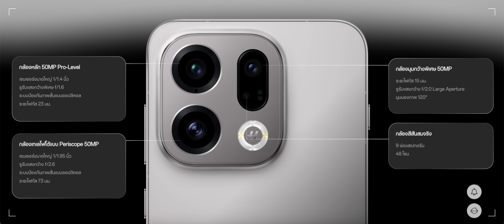 สำหรับ OPPO Find X9 Pro จะมีจุดเด่นอยู่ที่กล้องซูม Hasselblad Telephoto ความละเอียด 200MP เซนเซอร์ ISOCELL HP5 ขนาด 1/1.56 นิ้ว รูรับแสง f/1.5 ออปติคัลซูม 3 เท่า ซูมโดยไม่เสียรายละเอียดที่ระยะ 6 เท่า (Lossless Zoom) หรือสูงสุดที่ระยะ 13.2 เท่า และดิจิทัลซูมสูงสุด 120 เท่า