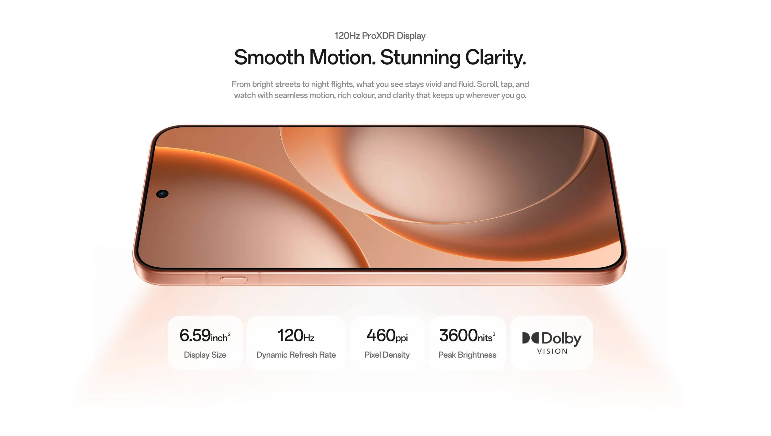 หน้าจอแสดงผล AMOLED ขนาด 6.59 นิ้ว ขอบจอบางเฉียบเพียง 1.15 มม. อัตรารีเฟรช 120Hz ความสว่างสูงสุด 3,500 นิต เพื่อรองรับการใช้งานเมื่อเจอแดดจ้ากลางแจ้ง รองรับการแสดงผล Dolby Vision