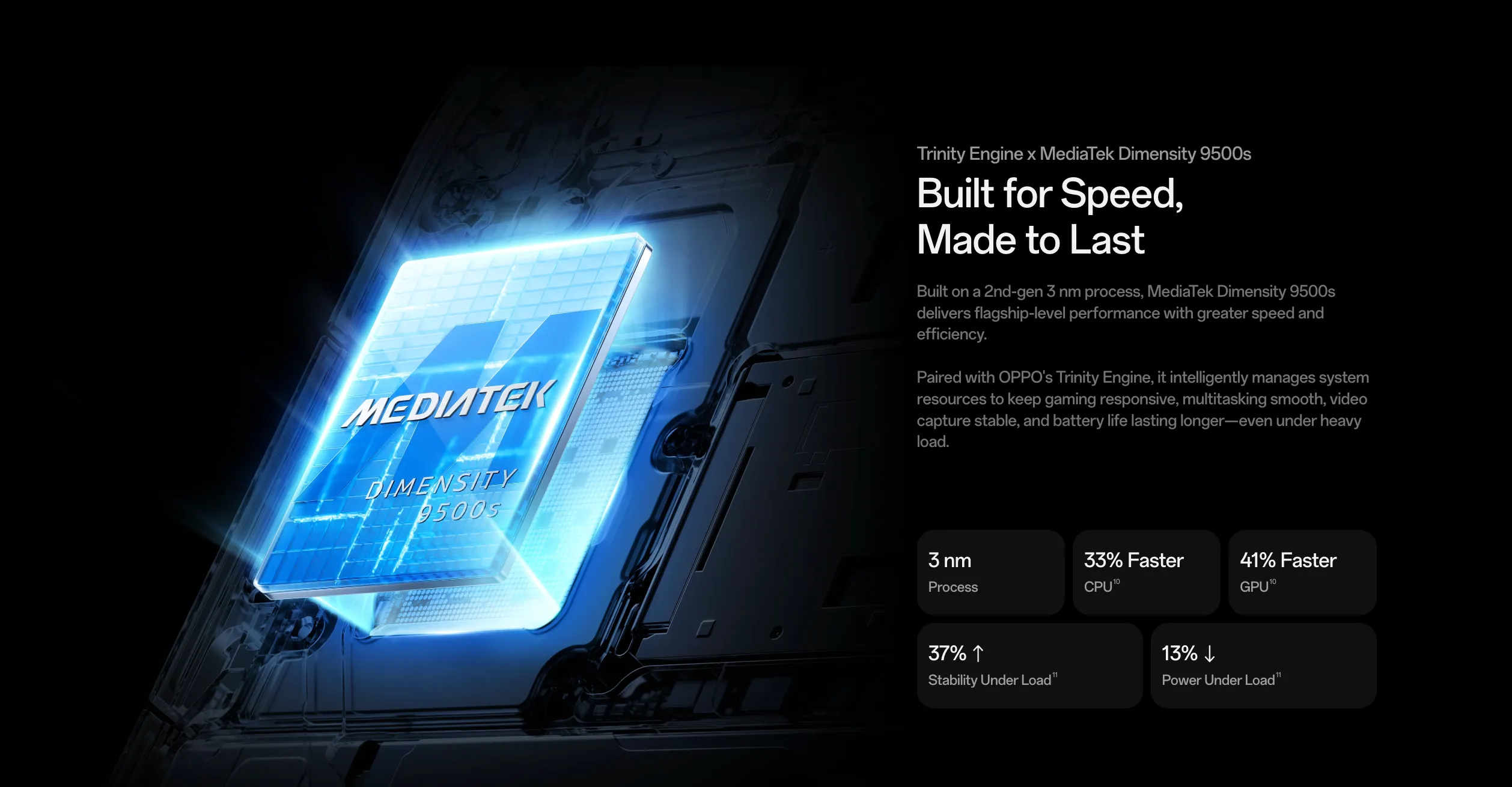 ชิปเซ็ต MediaTek Dimensity 9500s ขนาด 3 นาโนเมตร (เจเนอเรชันที่ 2) โดยให้ประสิทธิภาพของซีพียูกับจีพียูที่ดี เหมาะสำหรับการเล่นเกม ใช้ตัดต่อวิดีโอ ไถฟีดโซเชียลมีเดีย ใช้งานที่เน้นประสิทธิภาพได้อย่างลื่นไหล