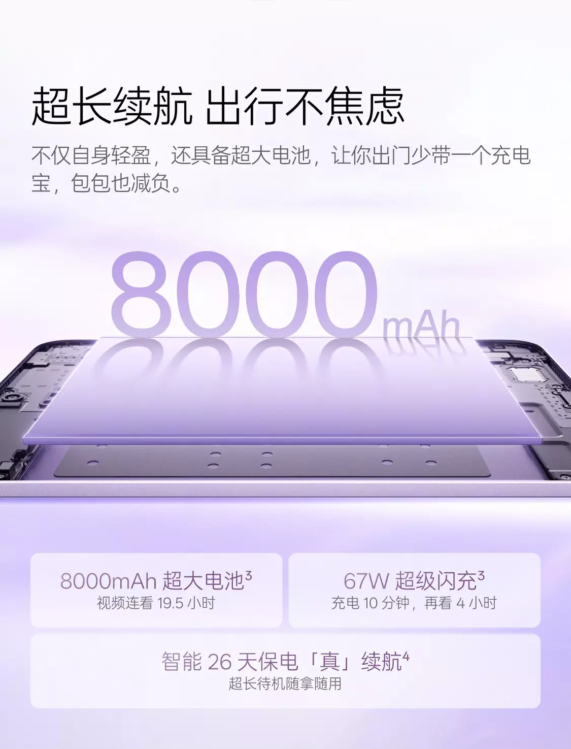 นอกจากตัวเครื่องจะบาง แบตเตอรี่ก็ให้ความจุมาถึง 8,000mAh สามารถใช้งานเพื่อดูวิดีโอได้นานสูงสุด 19.5 ชั่วโมง