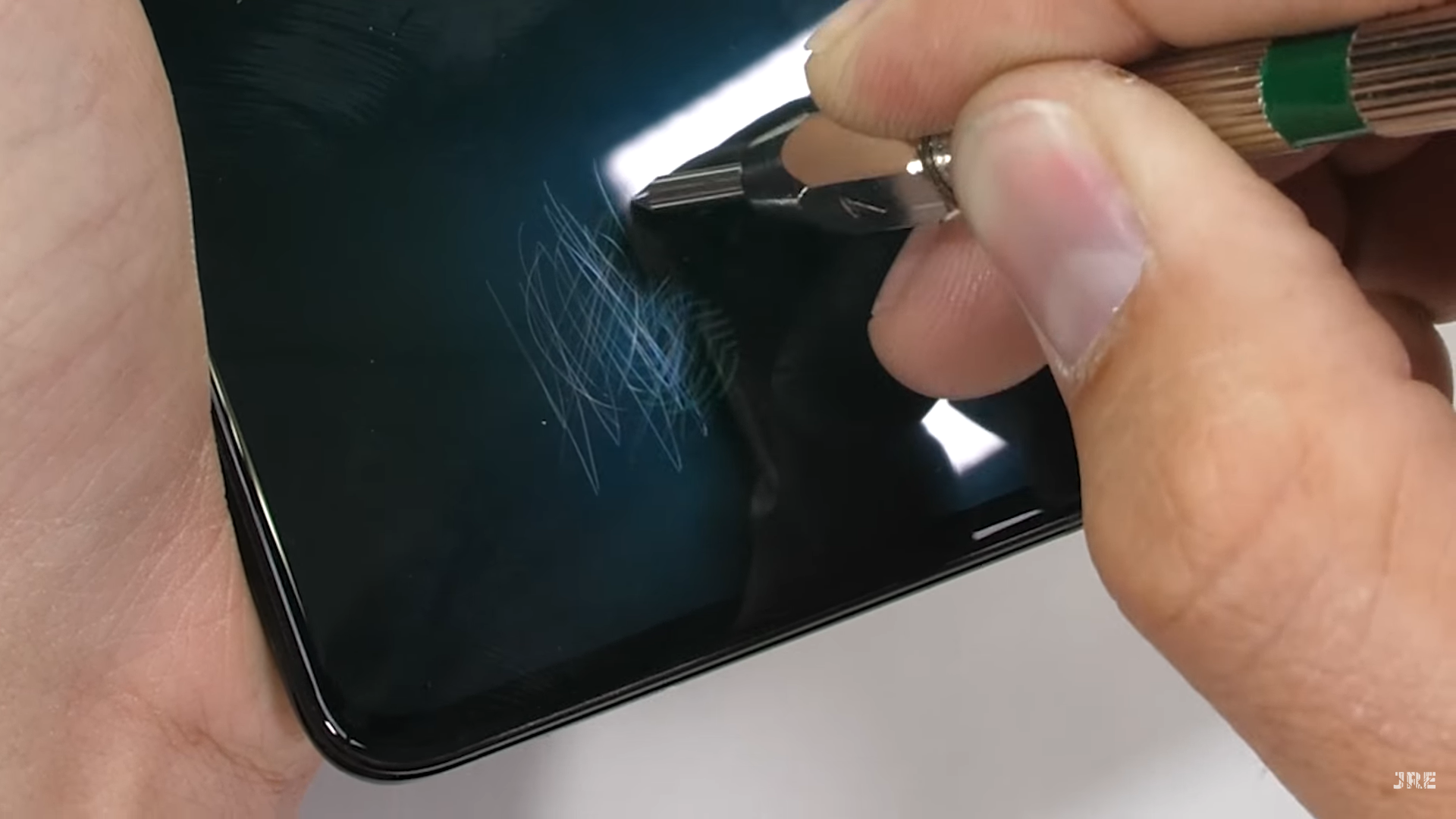 เริ่มกันที่หน้าจอก่อนเลย.. โดยปกติแล้วการทดสอบความทนทานของหน้าจอ กระจก Gorilla Glass 6 จะมีรอยขูดขีดของเครื่องมือที่มีความแข็งระดับ 5 และรอยนั้นก็จะลึกขึ้นในเครื่องมือระดับ 6 และ 7 ทว่า OPPO Reno กลับมีรอยขูดตั้งแต่เครื่องมือระดับ 3 เฉยเลย