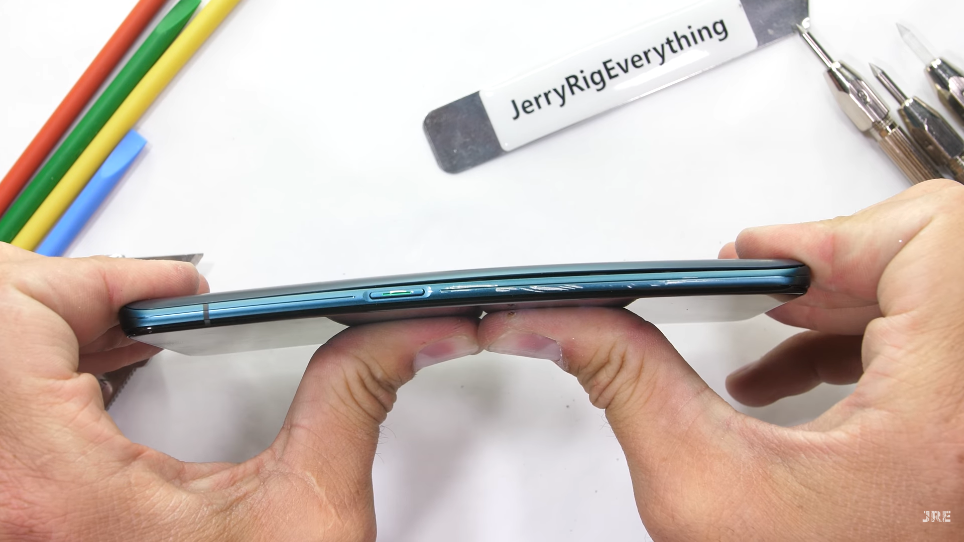 และสุดท้ายกับการทดสอบความแข็งแกร่งของตัวเครื่องด้วยการจับมางอด้วยมือเปล่า จากภาพจะเห็นว่าตัวเครื่องของ Reno งอได้นิดหน่อย จนกระจกหน้าจอปริออกมาจากตัวเครื่อง แต่สุดท้ายแล้วก็รอดมาได้ เพราะตัวเครื่องก็เด้งกลับมาอยู่ในสภาพเดิม ไม่มีอาการร้าว หรือแตกหักแต่อย่างใด