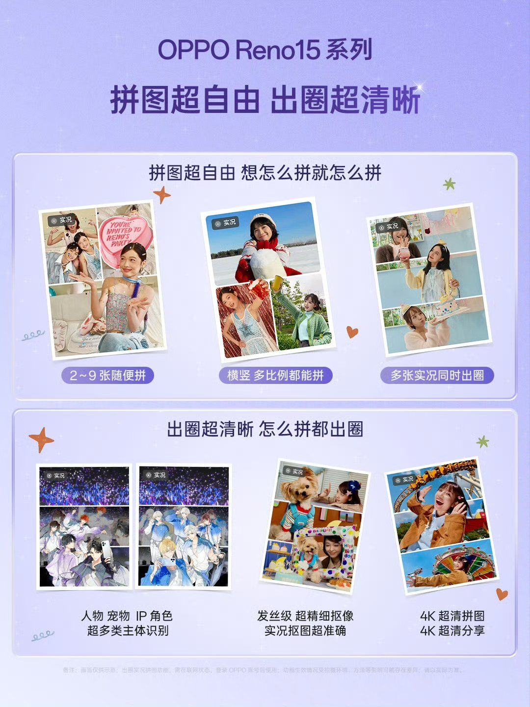- Multiple Live Photo Collage : ฟีเจอร์ Live Photo ของ OPPO Reno15 Series สามารถนำภาพถ่ายมาต่อกันได้มากสุดถึง 3 รูป พร้อมกับเป็นครั้งแรกที่ Live Photo รองรับการแยกวัตถุออกจากฉากหลังด้วยการใช้ AI ไม่ว่าจะเป็นภาพถ่ายบุคคล ภาพถ่ายสัตว์เลี้ยง
