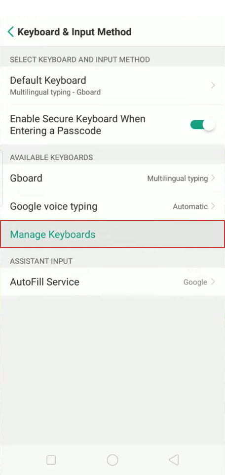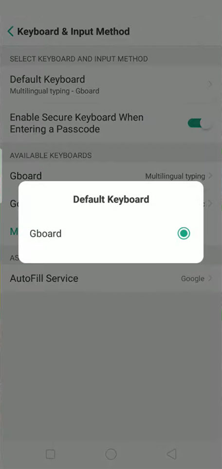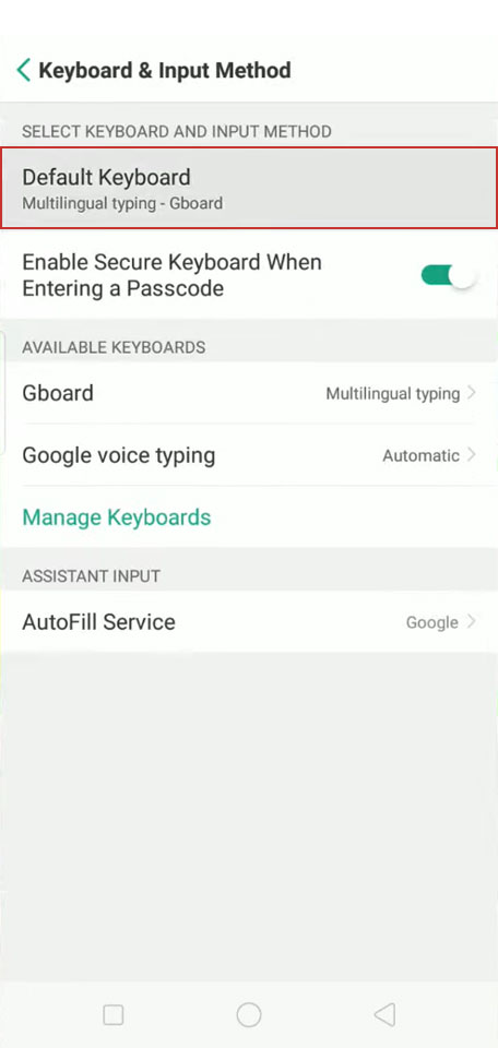 หากมีแอปคีย์บอร์ดเหลืออยู่เพียงตัวเดียว ระบบจะกำหนดให้แอปคีย์บอร์ดนั้น ๆ เป็นแอปคีย์บอร์ดเริ่มต้นโดยอัตโนมัติ แต่หากมีแอปคีย์บอร์ดมากกว่า 1 ตัว ผู้ใช้งานสามารถกำหนดเองได้จากเมนู Default Keyboard (แป้นพิมพ์พื้นฐาน) ที่อยู่ในหน้าเดียวกันตามภาพ ด้านล่าง