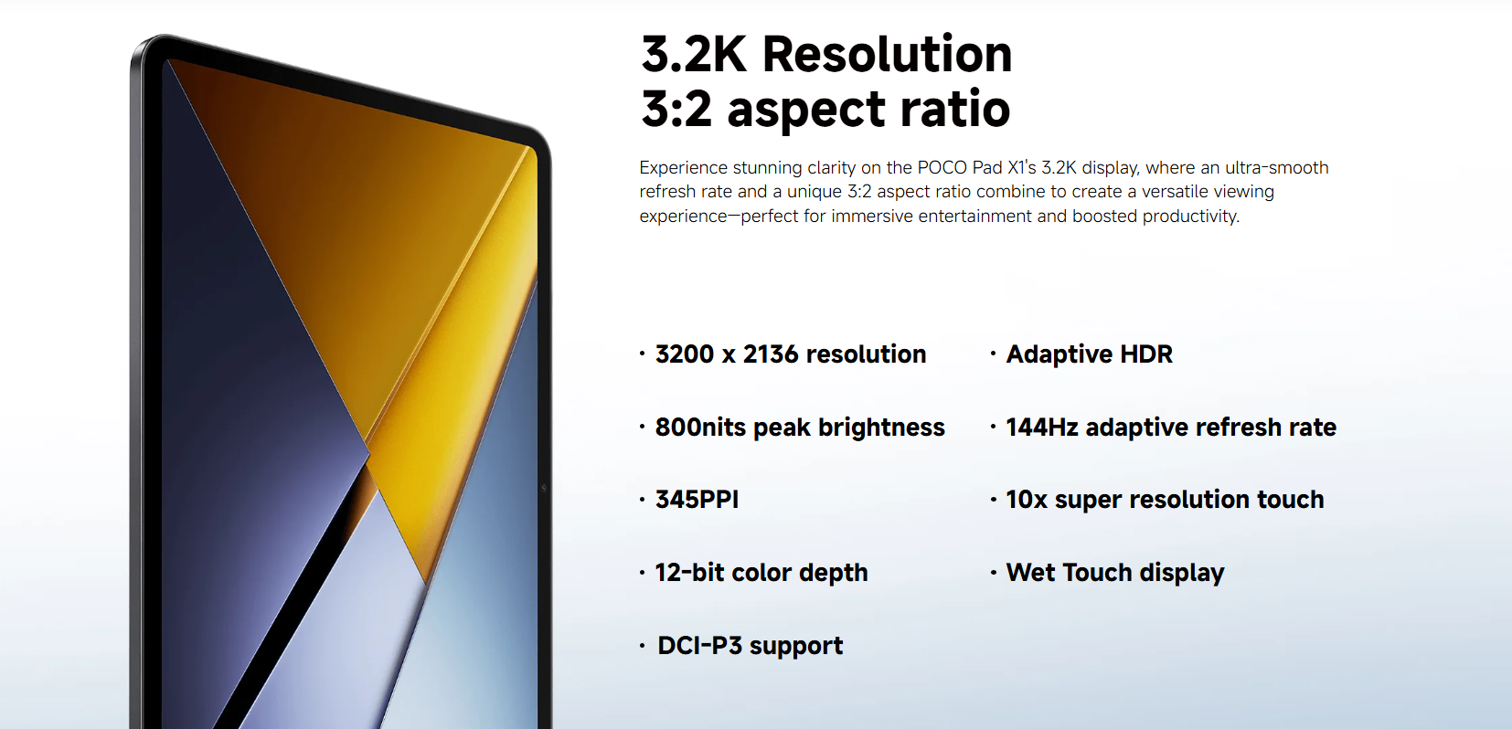 เริ่มต้นที่รุ่นท็อปสุดอย่าง POCO Pad X1 ซึ่งมาพร้อมกับหน้าจอ IPS LCD ขนาด 11.2 นิ้ว อัตราส่วนหน้าจอ 3:2 พร้อมความละเอียด 3.2K และอัตรารีเฟรช 144Hz รองรับการแสดงผล HDR10 และ Dolby Vision ความสว่างหน้าจอสูงสุด 800 นิต