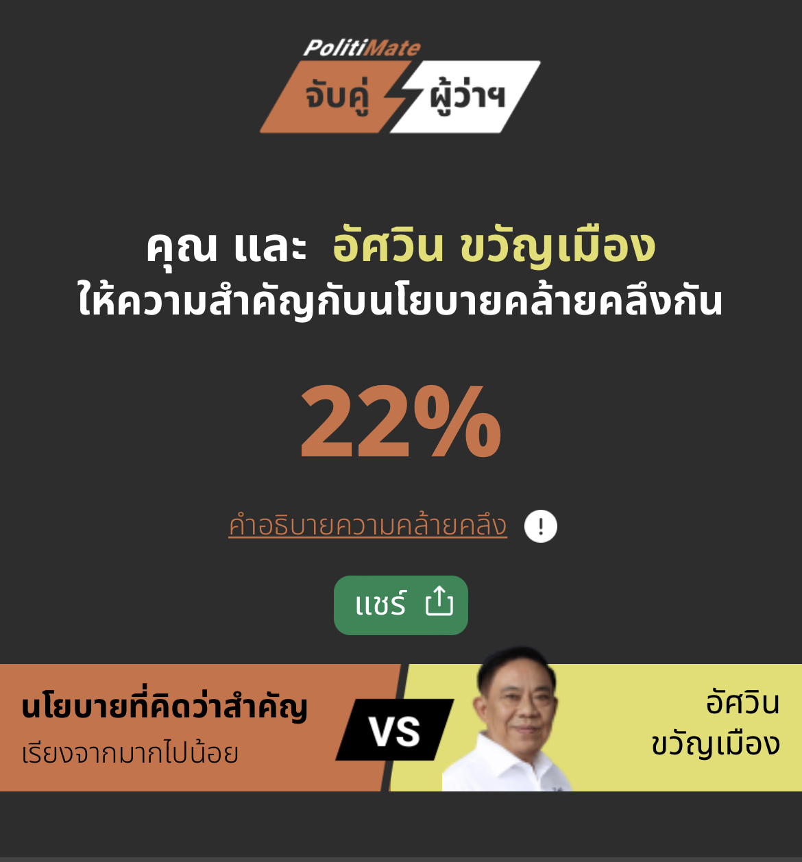 เห็นว่าเป็นแอปที่ทำมาดีมากจนอยากจะแชร์ เผื่อใครที่ยังลังเล ตัดสินใจไม่ได้ อยากดูที่นโยบายเป็นหลัก ก็ลองเข้าไปตั้งต้นกันที่แอปนี้กันได้เลยที่ https://politimate.vote62.com/