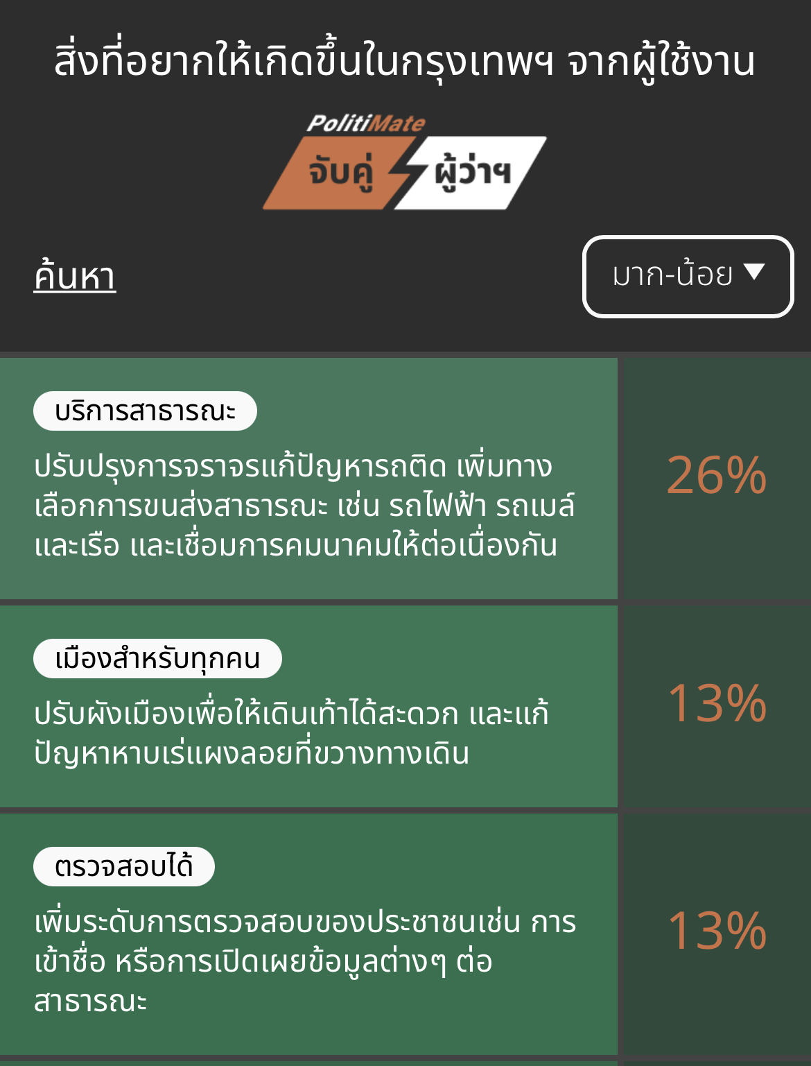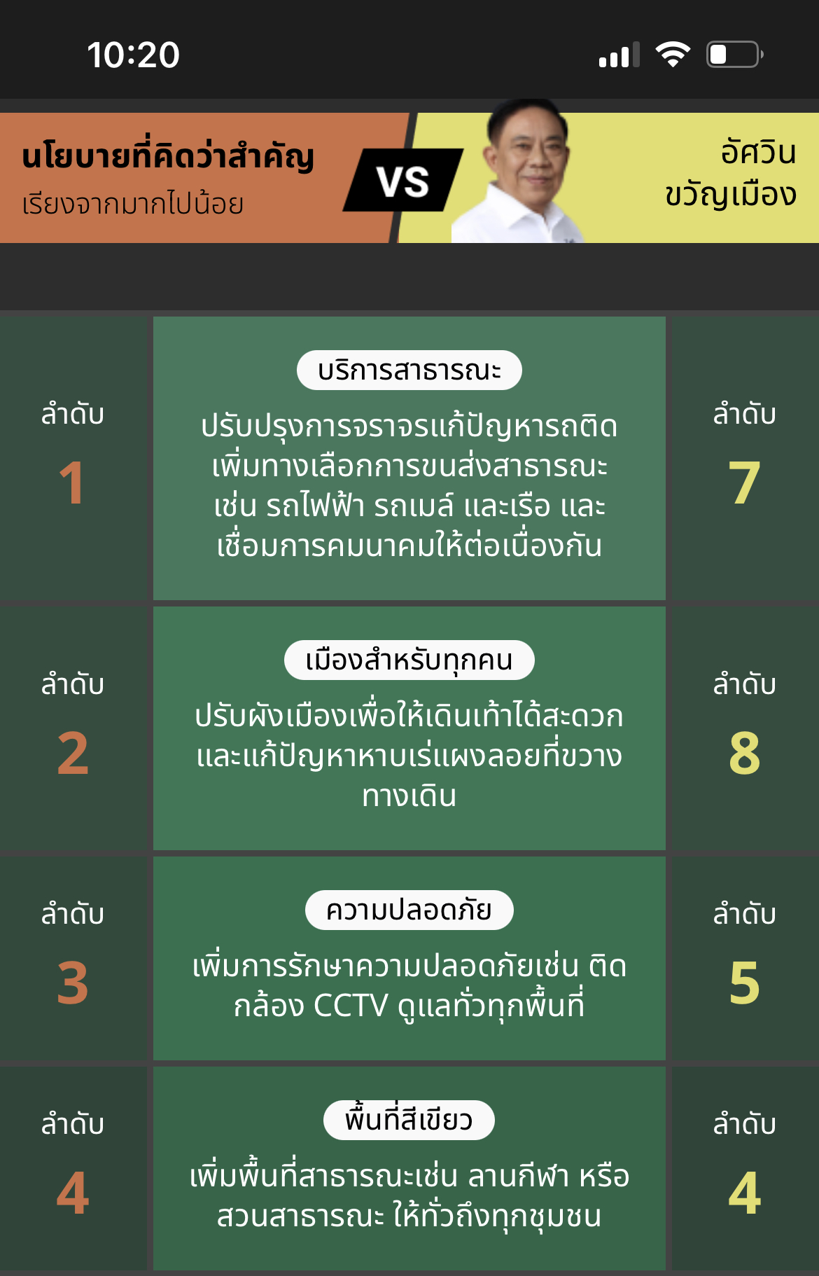 โดยนโยบายที่นำมาให้เลือกนี้จะถูกหยิบมาจาก 10 นโยบายหลักในการพัฒนากทม. มาสุ่มให้จับคู่กัน แล้วเราก็แค่เลือก “นโยบายเราคิดว่าสำคัญกว่า” ทั้งหมด 20 ครั้ง จากนั้นระบบก็จะจัด ranking พร้อมเปรียบเทียบว่า ตัวคุณให้ความสำคัญกับนโยบาย “คล้าย” ผู้สมัครฯ รายใดมากที่สุด คิดเป็นกี่เปอร์เซ็นต์ รวมถึงดูเปอร์เซ็นต์ของผู้สมัครรายอื่น และดูรายละเอียดว่า ผู้สมัครฯ แต่ละคนให้ความสำคัญกับนโยบายเรื่องใดเป็นลำดับที่ 1-10 ได้อีกด้วย