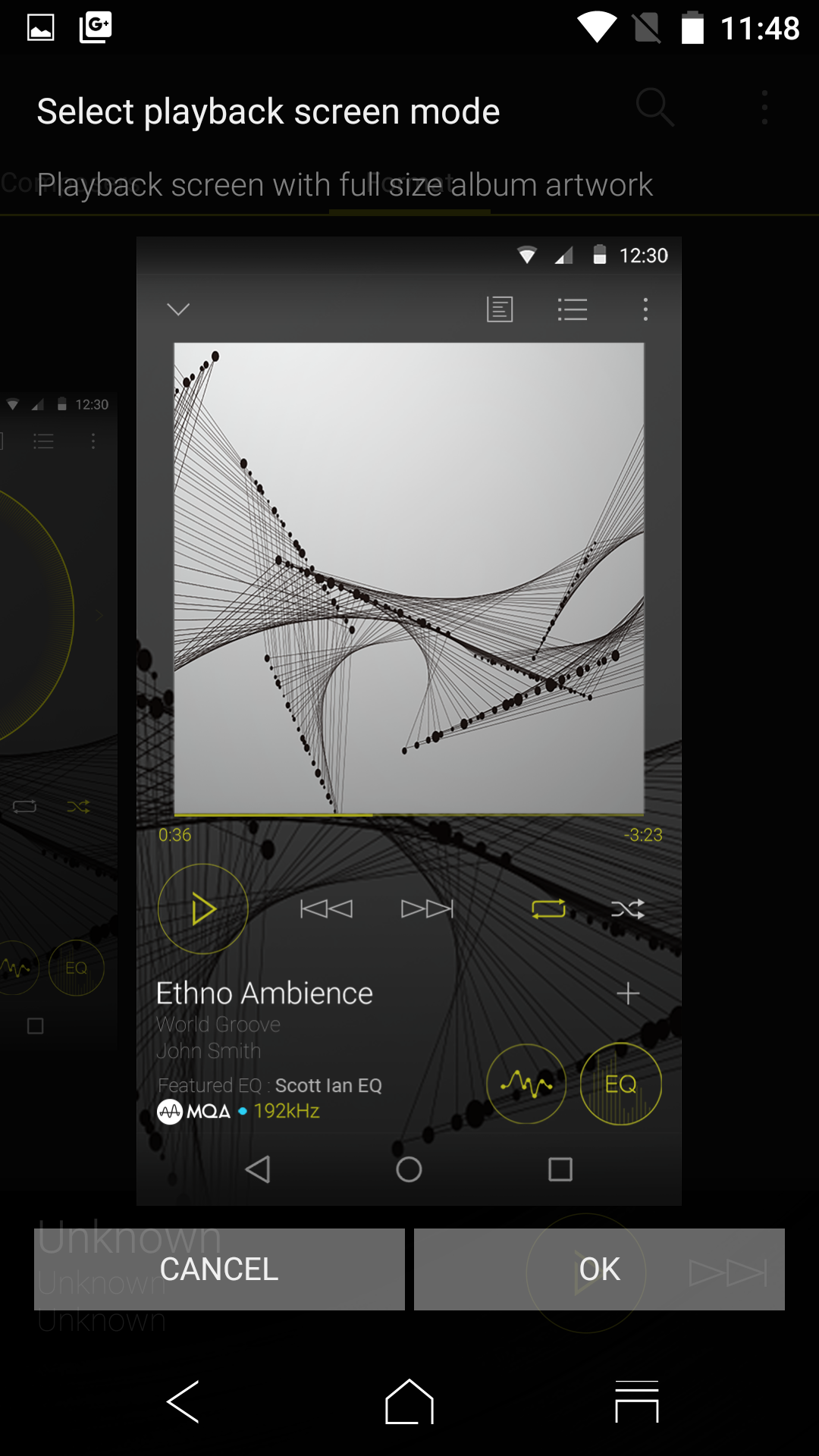 มาดูที่ตัว Music กันดีกว่า เพราะเรียกว่าเป็นแอปที่ทำมาเป็นจุดขายคู่กับตัวฮาร์ดแวร์ด้านเสียงเลยทีเดียว เปิดแอปเข้ามาก็จะเป็นแท็บต่างๆ ที่ให้เราเลือกว่าจะเลือกไฟล์จากไหน, แบ่งตามนักร้อง, อัลบัม, เพลย์ลิสต์ หรือประเภทฟอร์แมตของเพลง ที่หน้าเล่นเพลงก็จะเลือกได้ครับว่าชอบการแสดงผลแบบไหนระหว่างปกอัลบัม เป็นพื้นหลัง แล้วมีวงกลมสำหรับบอกเวลาของเพลง และเลื่อนปรับช่วงเวลาได้ กับแบบคลาสสิคที่แสดงปกอัลบัม แล้วมีปุ่ม Play/Pause, Rewind, Forward ให้กดต่างหาก นอกจากนี้ก็ยังมีออปชันปรับ Equalizer ขวาล่าง และแสดงความละเอียดไฟล์เพลงที่ซ้ายล่างจอด้วย อ้อ แล้วด้านบนก็จะมีให้กดดูเนื้อเพลงได้ด้วยครับ โดยทางแอปจะค้นเนื้อเพลงผ่านระบบของมาแสดงให้ ซึ่งจากที่ทดสอบก็ถือว่ามีข้อมูลเนื้อเพลงเยอะพอสมควร เพลงใหม่ เพลงเก่าก็มีเยอะ