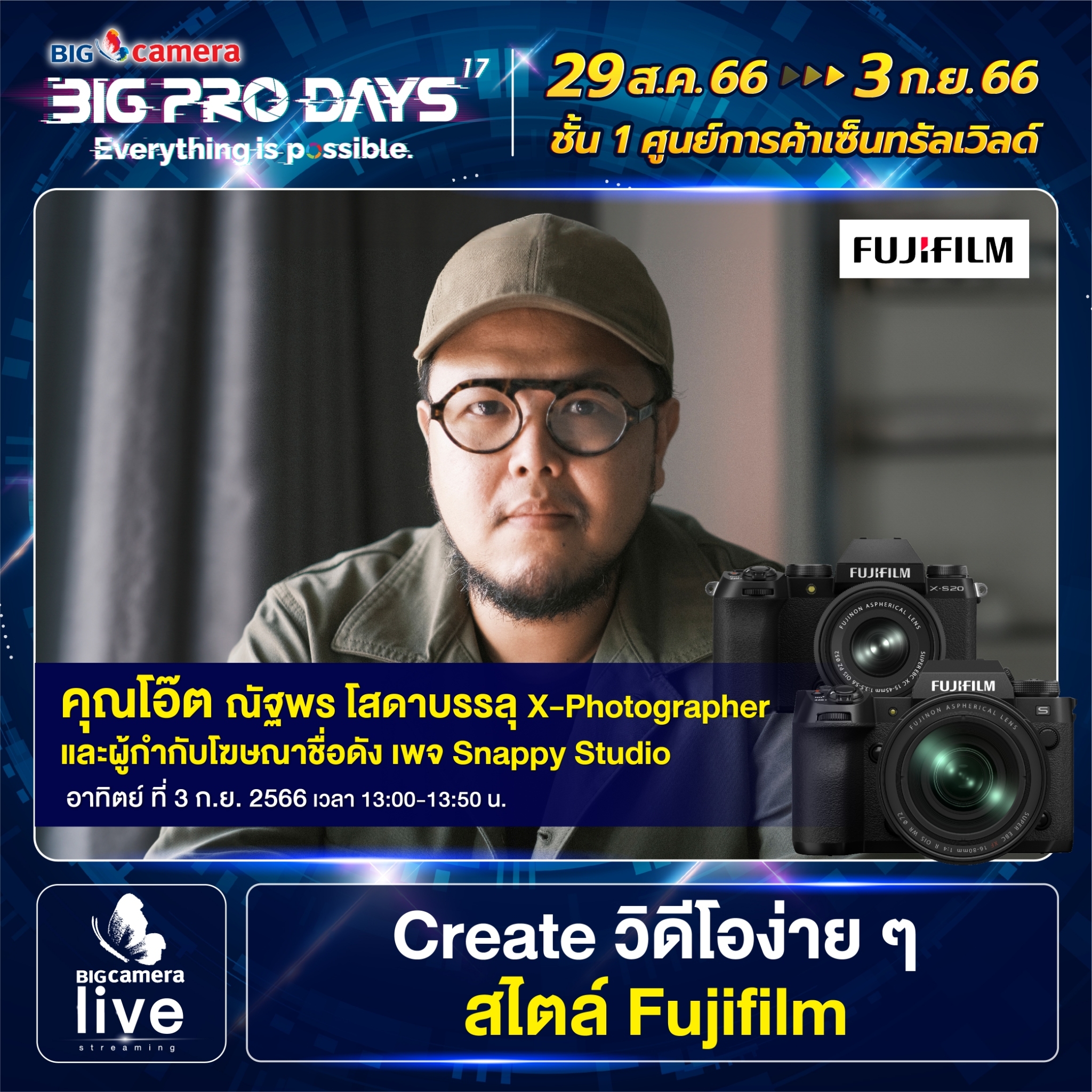 เริ่มแล้วงาน BIG CAMERA BIG PRO DAYS 17th (บิ๊ก คาเมร่า บิ๊กโปร เดย์ ครั้งที่ 17) ยกทัพกล้องและอุปกรณ์กล้องดิจิทัลจากแบรนด์ชั้นนำกว่า 60 แบรนด์ มาจัดโปรคุ้มลดสูงสุดกว่า 70% พร้อมรับเงินคืนสูงสุด 45,000 บาท ส่วนสาย Centent Creator ห้ามพลาด ฟรี! บริการจัดเซตอุปกรณ์สำหรับงาน LIVE, VLOG, YouTube และยังมี Workshop แบ่งปันประสบการณ์จากช่างภาพชื่อดัง ตั้งแต่วันที่ 29 สิงหาคม ถึง วันที่ 3 กันยายน 2566 ณ ศูนย์การค้าเซ็นทรัลเวิลด์ ชั้น 1 โซน Central Court, โซน Beacon และ โซน Eden