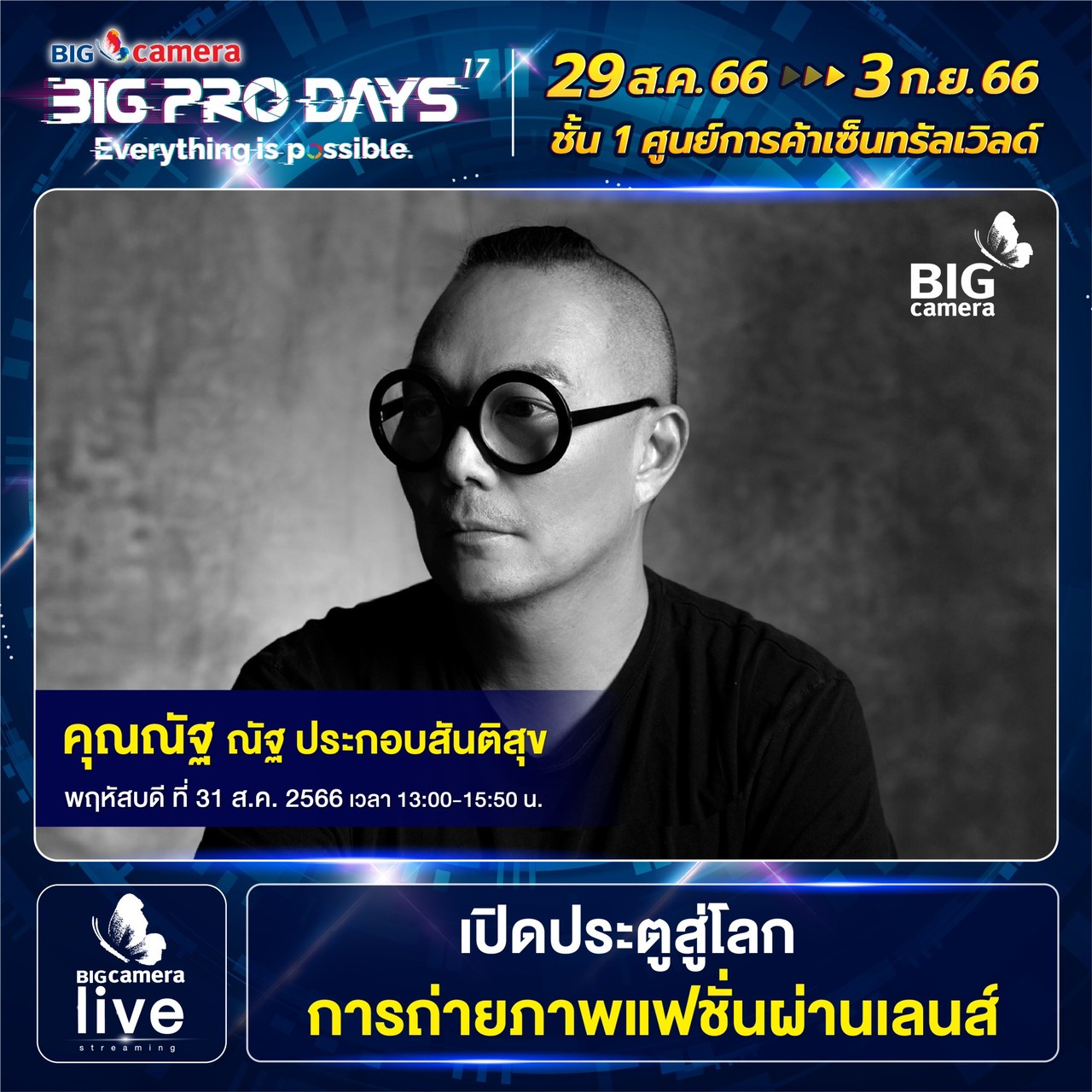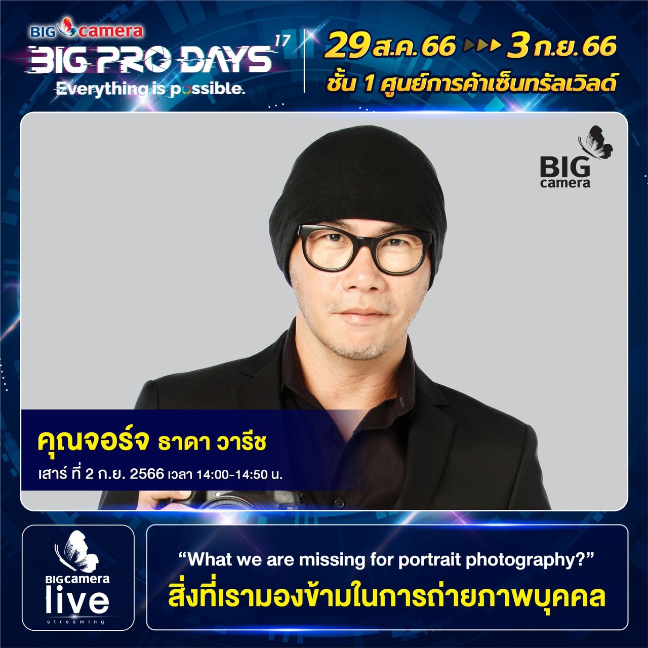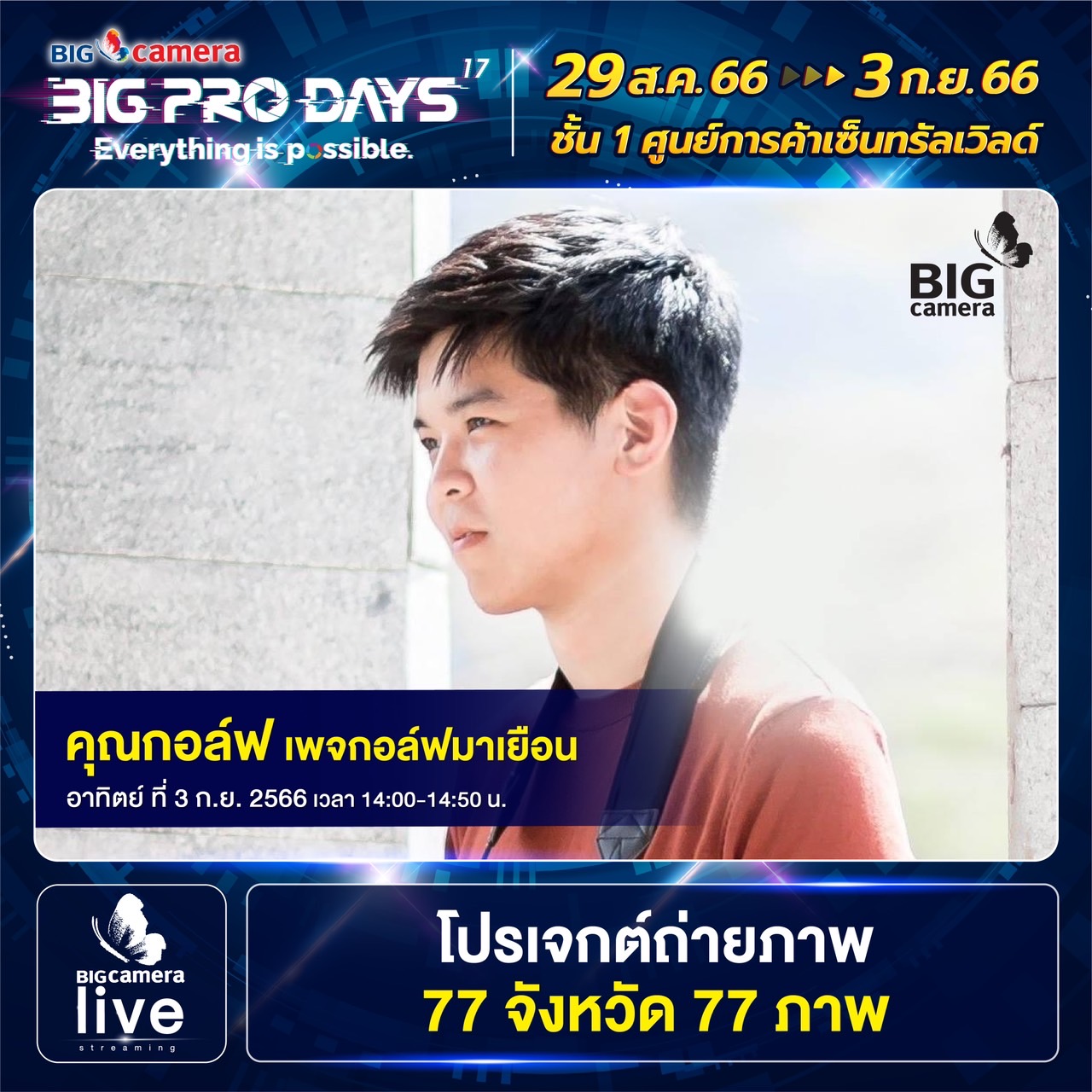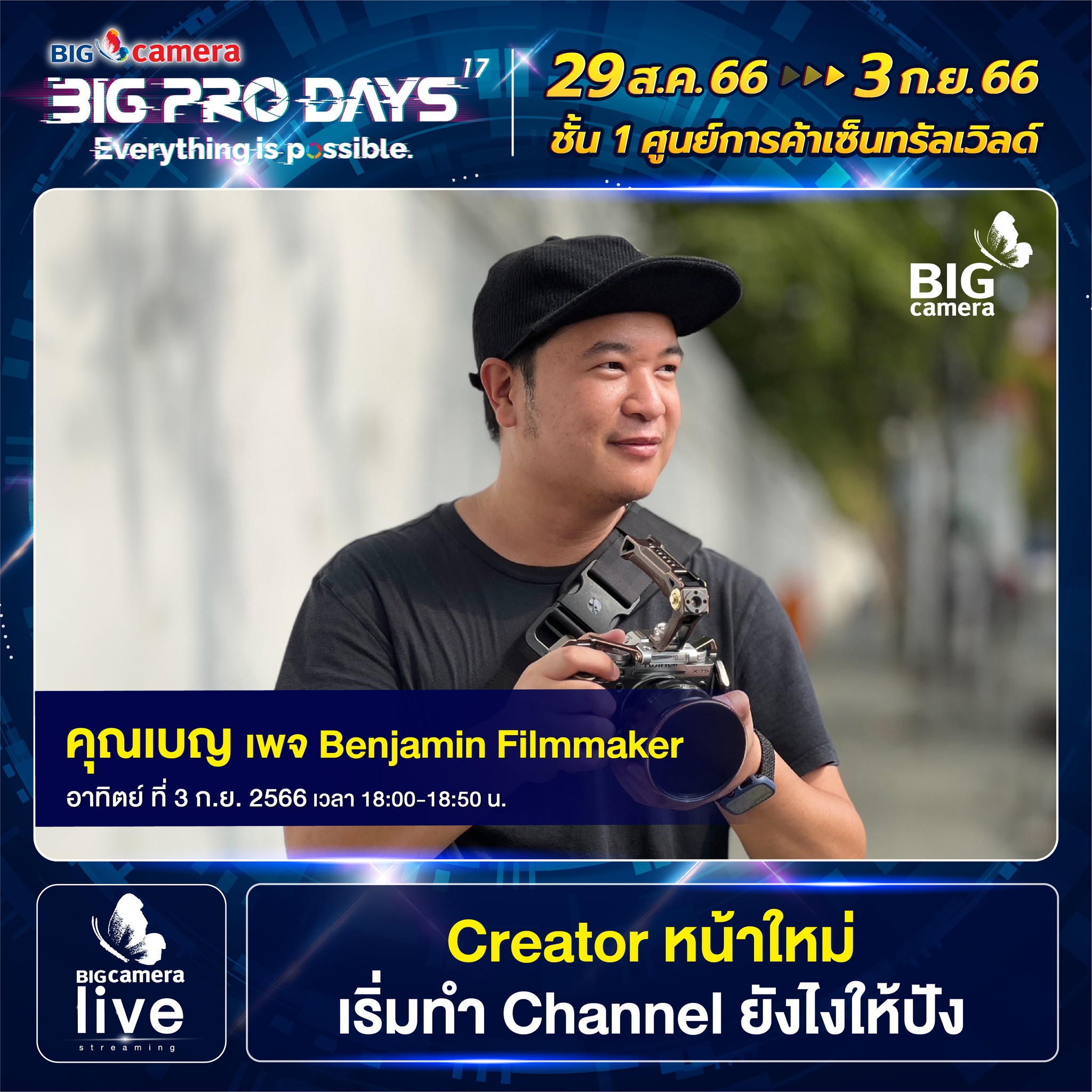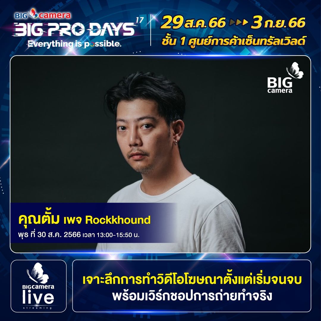 เริ่มแล้วงาน BIG CAMERA BIG PRO DAYS 17th (บิ๊ก คาเมร่า บิ๊กโปร เดย์ ครั้งที่ 17) ยกทัพกล้องและอุปกรณ์กล้องดิจิทัลจากแบรนด์ชั้นนำกว่า 60 แบรนด์ มาจัดโปรคุ้มลดสูงสุดกว่า 70% พร้อมรับเงินคืนสูงสุด 45,000 บาท ส่วนสาย Centent Creator ห้ามพลาด ฟรี! บริการจัดเซตอุปกรณ์สำหรับงาน LIVE, VLOG, YouTube และยังมี Workshop แบ่งปันประสบการณ์จากช่างภาพชื่อดัง ตั้งแต่วันที่ 29 สิงหาคม ถึง วันที่ 3 กันยายน 2566 ณ ศูนย์การค้าเซ็นทรัลเวิลด์ ชั้น 1 โซน Central Court, โซน Beacon และ โซน Eden