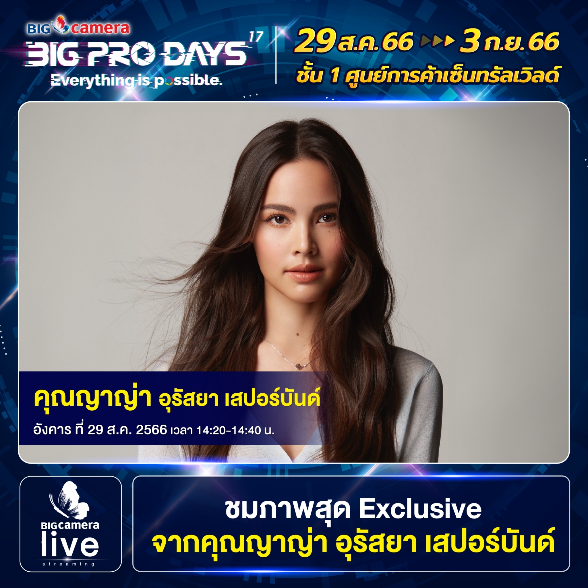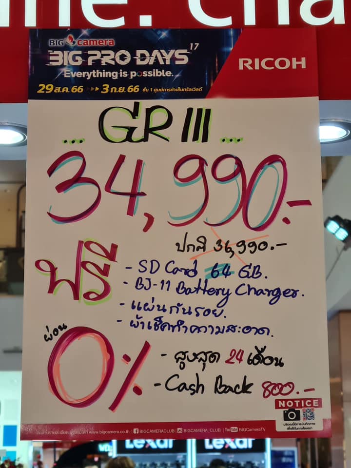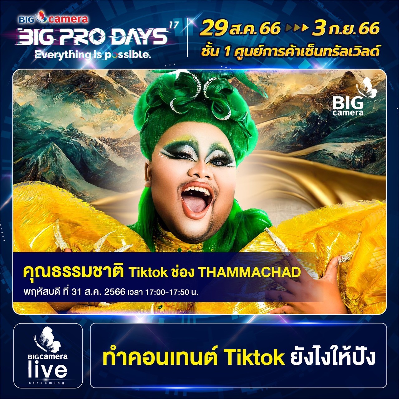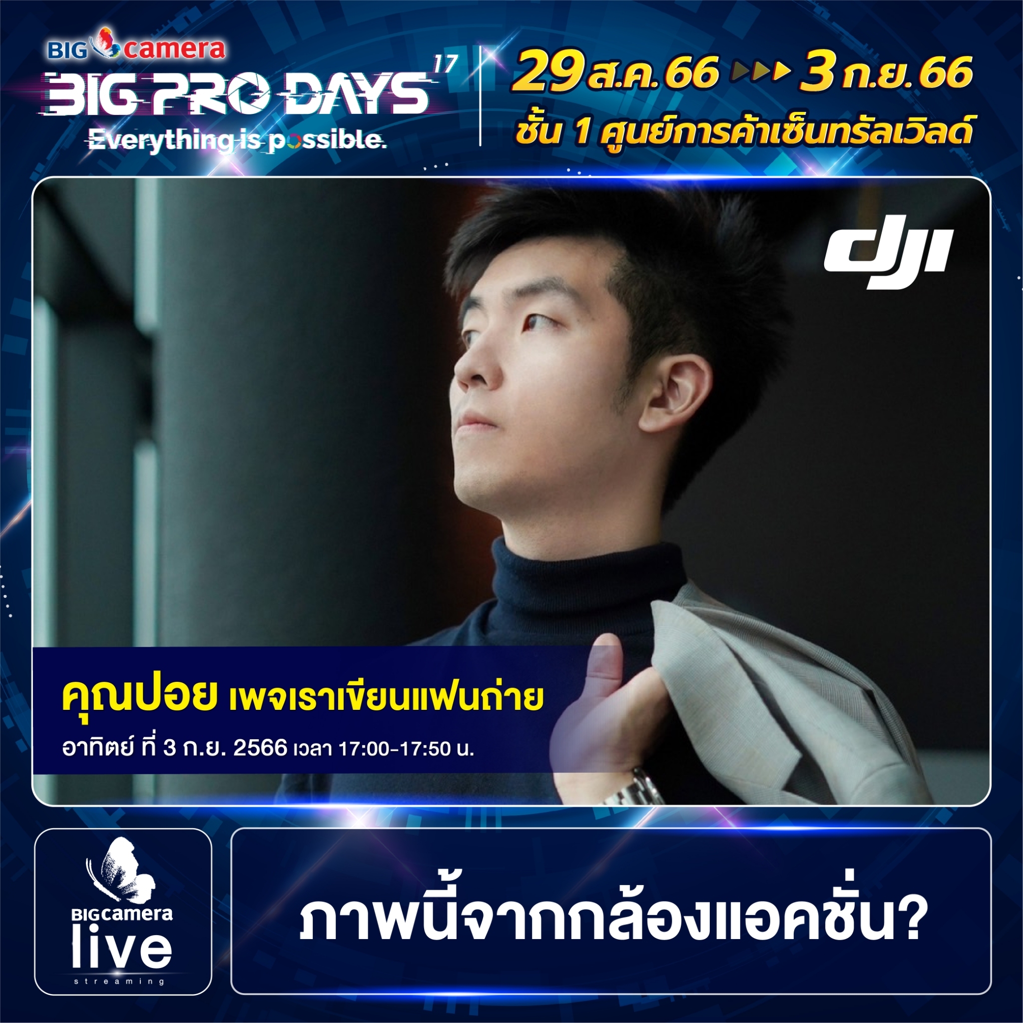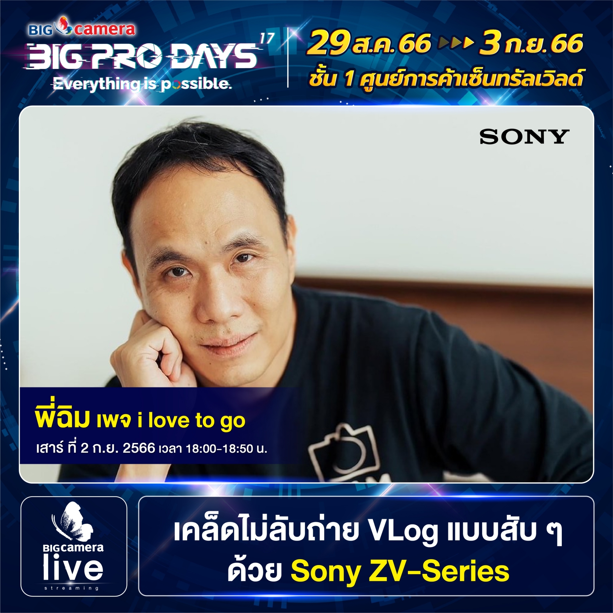 เริ่มแล้วงาน BIG CAMERA BIG PRO DAYS 17th (บิ๊ก คาเมร่า บิ๊กโปร เดย์ ครั้งที่ 17) ยกทัพกล้องและอุปกรณ์กล้องดิจิทัลจากแบรนด์ชั้นนำกว่า 60 แบรนด์ มาจัดโปรคุ้มลดสูงสุดกว่า 70% พร้อมรับเงินคืนสูงสุด 45,000 บาท ส่วนสาย Centent Creator ห้ามพลาด ฟรี! บริการจัดเซตอุปกรณ์สำหรับงาน LIVE, VLOG, YouTube และยังมี Workshop แบ่งปันประสบการณ์จากช่างภาพชื่อดัง ตั้งแต่วันที่ 29 สิงหาคม ถึง วันที่ 3 กันยายน 2566 ณ ศูนย์การค้าเซ็นทรัลเวิลด์ ชั้น 1 โซน Central Court, โซน Beacon และ โซน Eden