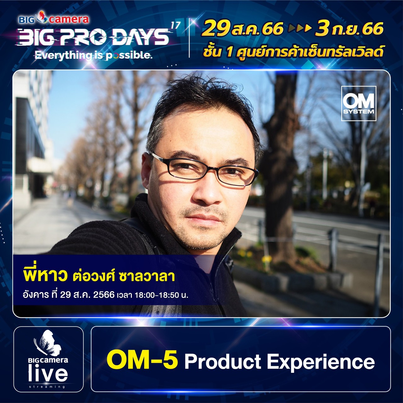 - (อังคารที่ 29) คุณหาว-ต่อวงศ์ ซาลวาลา เพจ 2how เจาะลึกและอัพเดทเทคโนโลยีทางการถ่ายภาพผ่านประสบการณ์ใช้งานจริงของกล้อง OM SYSTEM OM-5
