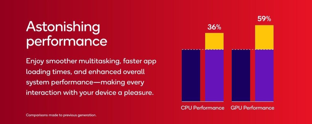 ในแง่ของประสิทธิภาพเองก็ได้รับการอัปเกรดให้ดียิ่งขึ้นด้วยการผลิตบนเทคโนโลยีขนาด 4 นาโนเมตร (Samsung) เริ่มต้นที่ CPU Qualcomm Kryo แบบ 8 คอร์ ความเร็วประมวลผลสูงสุด 2.4GHz ที่แรงขึ้นจากรุ่นก่อนหน้า 36% ส่วน GPU Qualcomm Adreno ก็มีประสิทธิภาพดีกว่าเดิมถึง 59%