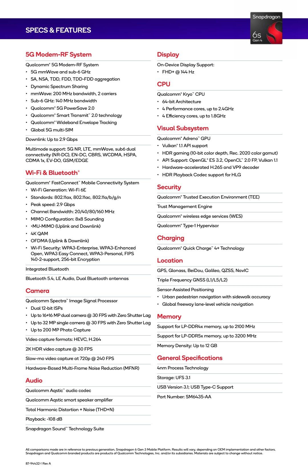 Snapdragon 6s Gen 4 ชิปเซ็ตระดับกลางรุ่นล่าสุดจากทาง Qualcomm เปิดตัวอย่างเป็นทางการแล้ว พัฒนาต่อยอดมาจากรุ่นที่แล้วอย่าง Snapdragon 6s Gen 3 เล็กน้อย ไม่ว่าจะเป็นประสิทธิภาพของซีพียูกับจีพียูที่เร็วแรงกว่าเดิม รองรับเทคโนโลยีหน้าจอ 144Hz ที่ความละเอียด FHD+