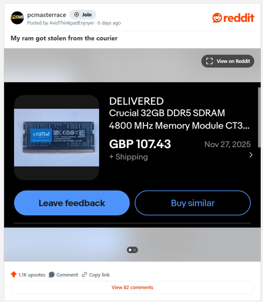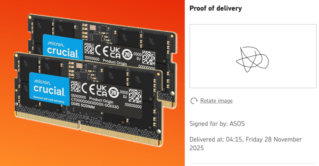 หนึ่งในเคสที่ถูกพูดถึงมากที่สุดคือโพสต์ของผู้ใช้ Reddit รายหนึ่งในสหราชอาณาจักร เขาสั่ง Crucial 32GB DDR5 ผ่านร้านค้าออนไลน์ แต่พัสดุกลับถูกอัปเดตสถานะว่า “จัดส่งสำเร็จ” ตอนตีสี่กว่า แถมขึ้นสถานที่ที่อยู่ห่างบ้านเขากว่า 300 ไมล์ และลายเซ็นผู้รับก็เป็นลายเส้นประหลาดคล้ายสัญลักษณ์มากกว่าจะเป็นชื่อบุคคลปกติ เมื่อเขาได้รับกล่องจริง ก็พบว่าเป็นเพียงซองเปล่า ไม่มีแรมอยู่ข้างในแม้แต่นิดเดียว