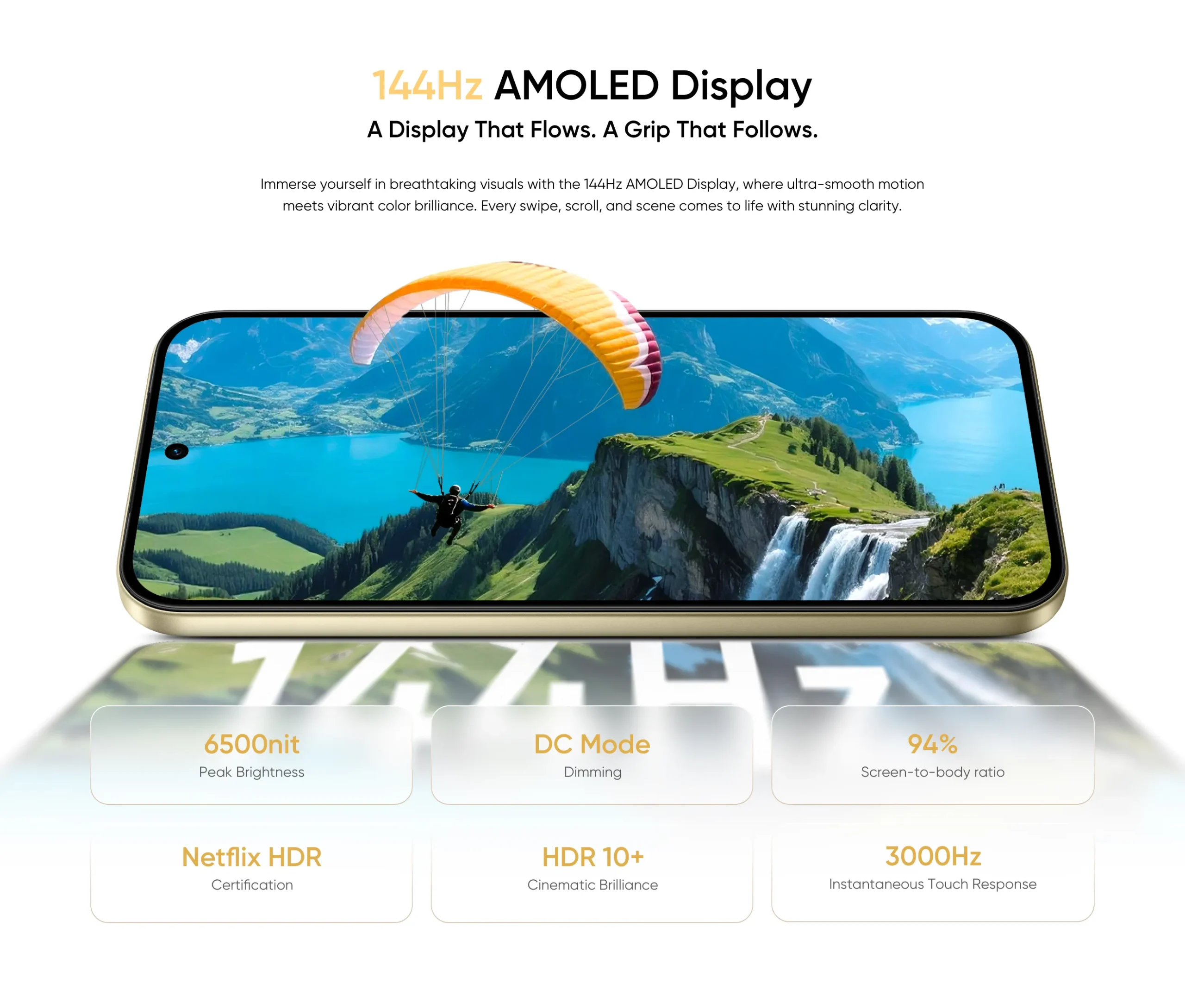 ชิปเซ็ตเลือกใช้เป็น Snapdragon 7 Gen 4 หน่วยความจำแบบ LPDDR5X และ UFS 3.1 หน้าจอ AMOLED ขอบโค้งสี่ด้านขนาด 6.8 นิ้ว ความละเอียด 1.5K รีเฟรชเรต 144Hz ฝังเซนเซอร์สแกนลายนิ้วมือแบบออปติคัลไว้ด้านใต้