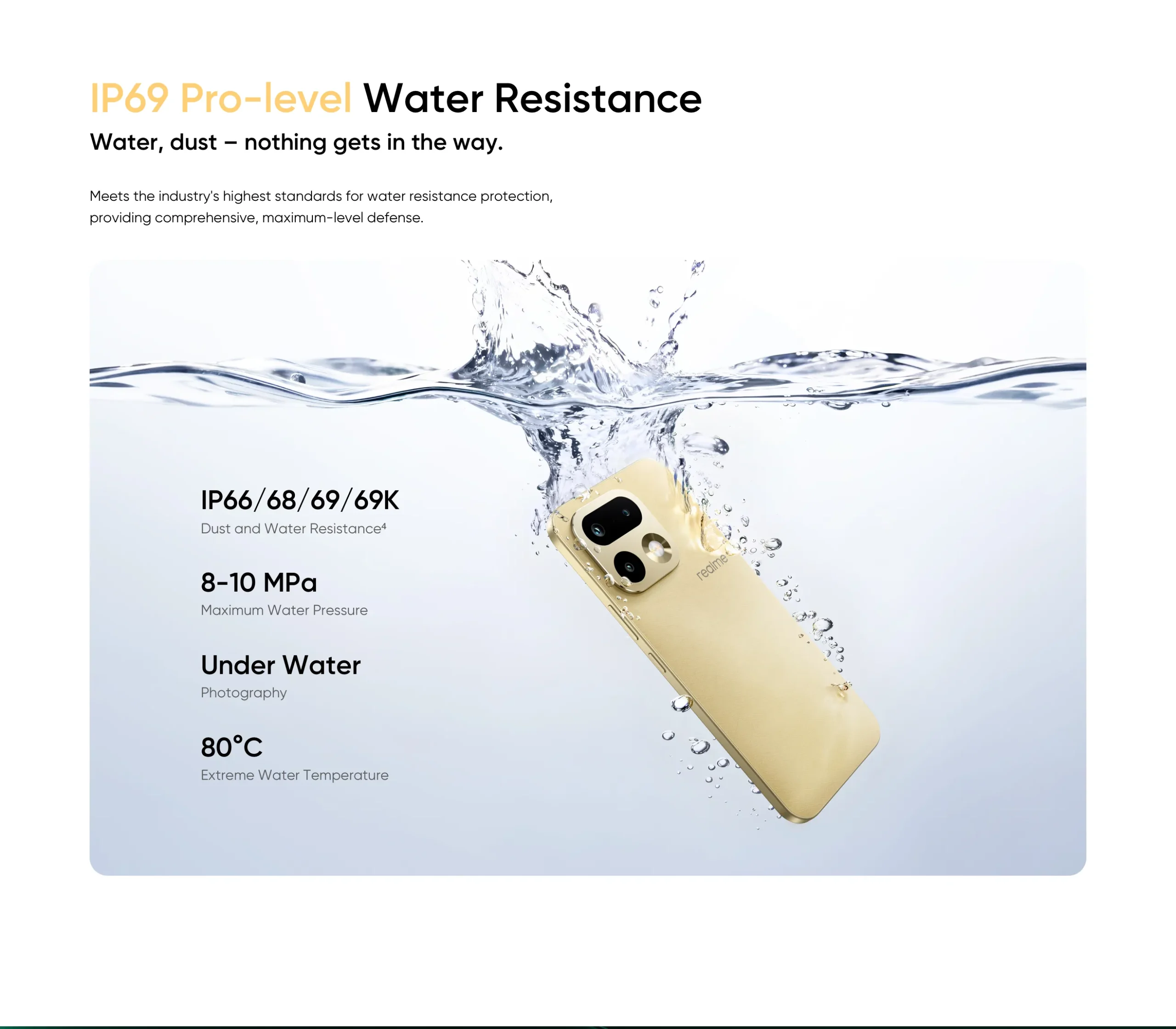 แบตเตอรี่ให้ความจุมาเยอะถึง 7,000mAh รองรับความเร็วการชาร์จ 80W มาตรฐานการทนน้ำทนฝุ่น IP69 ทำงานอยู่บนระบบปฏิบัติการ realme UI 7.0 บนพื้นฐาน Android 16 พร้อมระยะเวลาการอัปเดตเวอร์ชัน OS นาน 3 ปี แพทช์ความปลอดภัยอีก 4 ปี