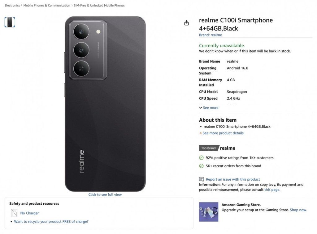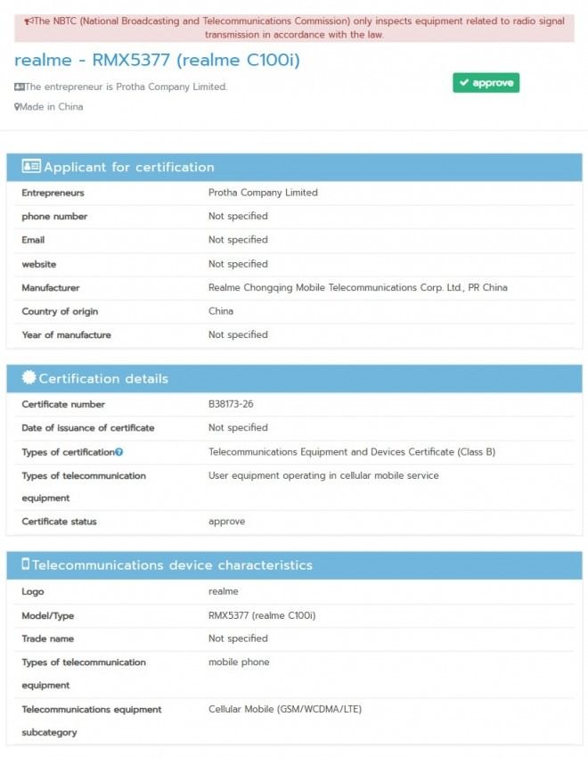 เรียกว่าโผล่มาเงียบ ๆ สำหรับสมาร์ตโฟนราคาสบายกระเป๋าอย่าง realme C100i หลังจากถูกมือดีไปเจอข้อมูลบนหน้าเว็บไซต์ Amazon ของประเทศสเปน อิตาลี ฝรั่งเศส ออสเตรเลีย และล่าสุดสมาร์ตโฟนรุ่นดังกล่าวยังไปปรากฏบนหน้าเว็บไซต์ของ กสทช. อีกด้วย