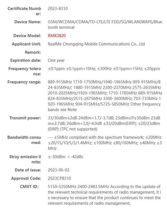 พบข้อมูลมือถือ realme เลขรุ่น RMX3820 และ RMX3823 ได้ผ่านการรับรองจากฐานกระทรวงอุตสาหกรรมและเทคโนโลยีสารสนเทศของจีนหรือ MIIT แต่ยังไม่ชัดเจนว่าสองเลขรุ่นดังกล่าวหมายถึงมือถือสองรุ่น หรือเป็นรุ่นเดียวกันแต่ออกแบบมาสำหรับการใช้งานในเครือข่ายอื่น ๆ กันแน่ แต่มีคาดการณ์ไว้ว่าอาจเป็นรุ่นล่าสุดอย่าง realme GT Neo 5 Pro ก็เป็นได้