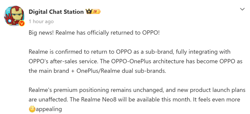Digital Chat Station ทิปสเตอร์จากฝั่งจีนออกมาให้ข้อมูลเพิ่มเติมว่า ‘การเปลี่ยนโครงสร้างองค์กรจะไม่กระทบกับไทม์ไลน์เปิดตัวสินค้าใหม่ ๆ’ ยกตัวอย่างเช่น realme Neo 8 ก็จะยังมีกำหนดเปิดตัวในประเทศจีนภายในเดือนมกราคมนี้ตามเดิมอย่างแน่นอน