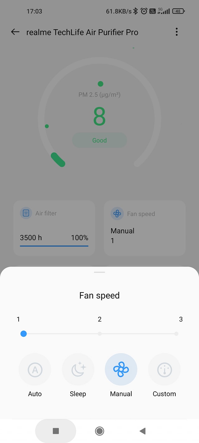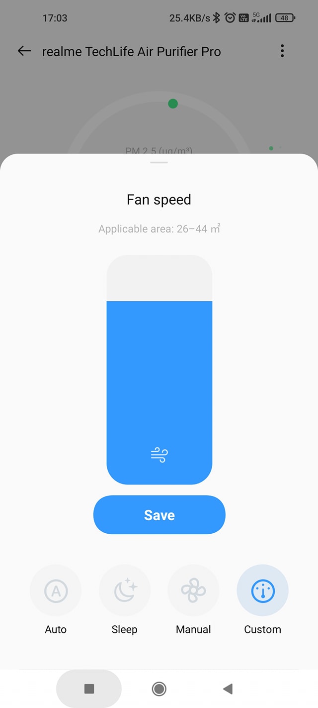 นอกจากจะกดเลือกความเร็วพัดลมจากตัวเครื่องได้แล้ว ก็ยังกดเลือกจากแอป realme Link ได้ด้วย โดยในแอปจะเลือกปรับความเร็วได้ละเอียดกว่าด้วยโหมด Custom