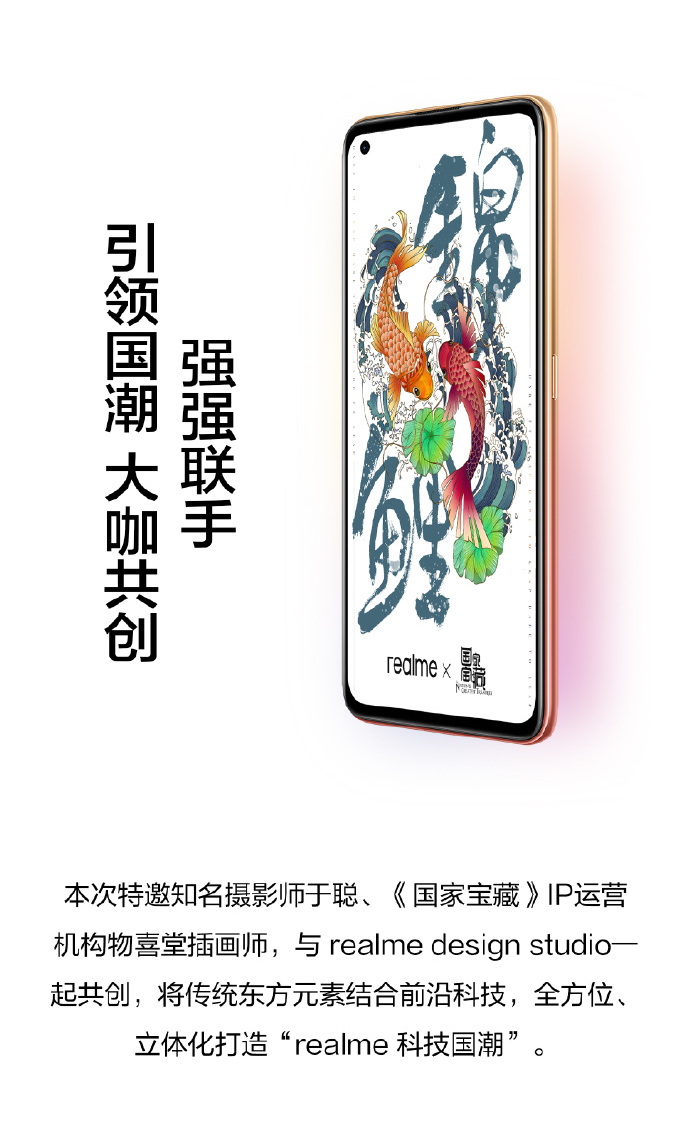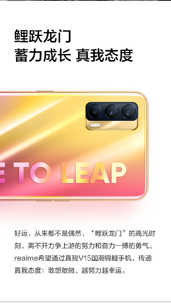 และสีฝาหลังของ realme V15 ได้แรงบันดาลใจมาจาก “ปลาคาร์ฟ” ซึ่งมีความเชื่อว่าเป็นสัญลักษณ์แห่งความสำเร็จในชีวิต ตัวแทนของความอุดมสมบูรณ์และความก้าวหน้า จากตำนานที่มันสามารถว่ายทวนกระแสแม่น้ำฮวงโหขึ้นไปได้สำเร็จจนกลายร่างเป็นมังกร โดย realme ได้ออกแบบให้มีเฉดสีมากมายเวลาสะท้อนแสงไม่ว่าจะเป็น ฟ้า, เหลือง, ส้ม, ม่วง, ชมพู และแดง