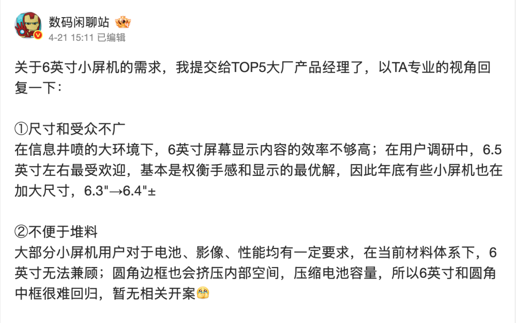 รายงานจากทิปสเตอร์ชื่อดังอย่าง Digital Chat Station ได้เผยว่าเขาได้พูดคุยกับผู้จัดการฝ่ายผลิตภัณฑ์ของแบรนด์สมาร์ตโฟนอันดับต้น ๆ ในประเทศจีน 5 แห่ง ซึ่งคาดว่าเป็น OPPO, vivo, HUAWEI, HONOR และ Xiaomi โดยทางคนวงในดังกล่าวของแต่ละแบรนด์ได้ให้เหตุผลเกี่ยวกับตลาดมือถือจอเล็กไว้อย่างน่าสนใจ