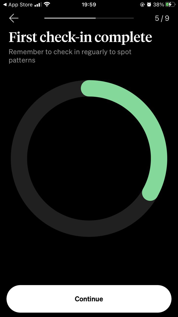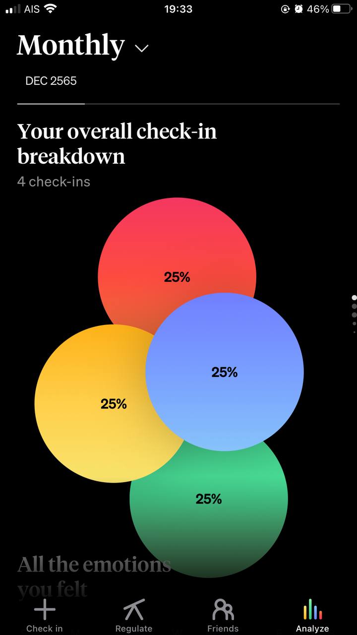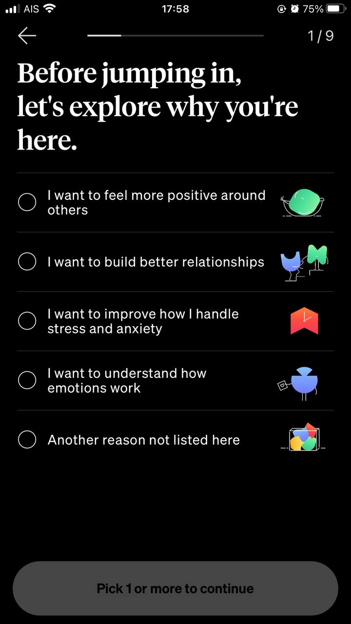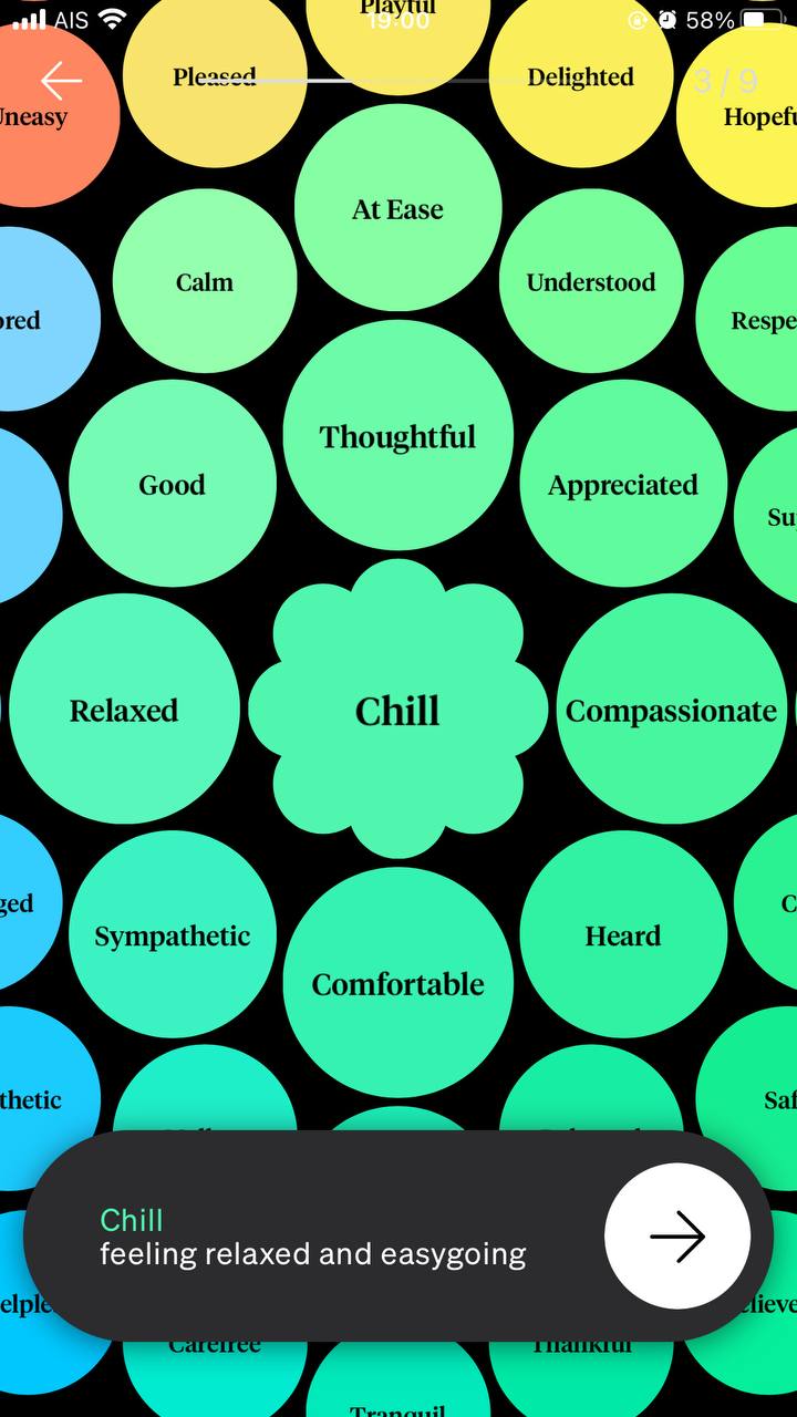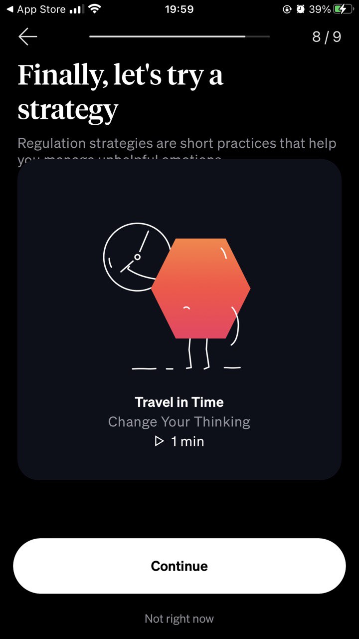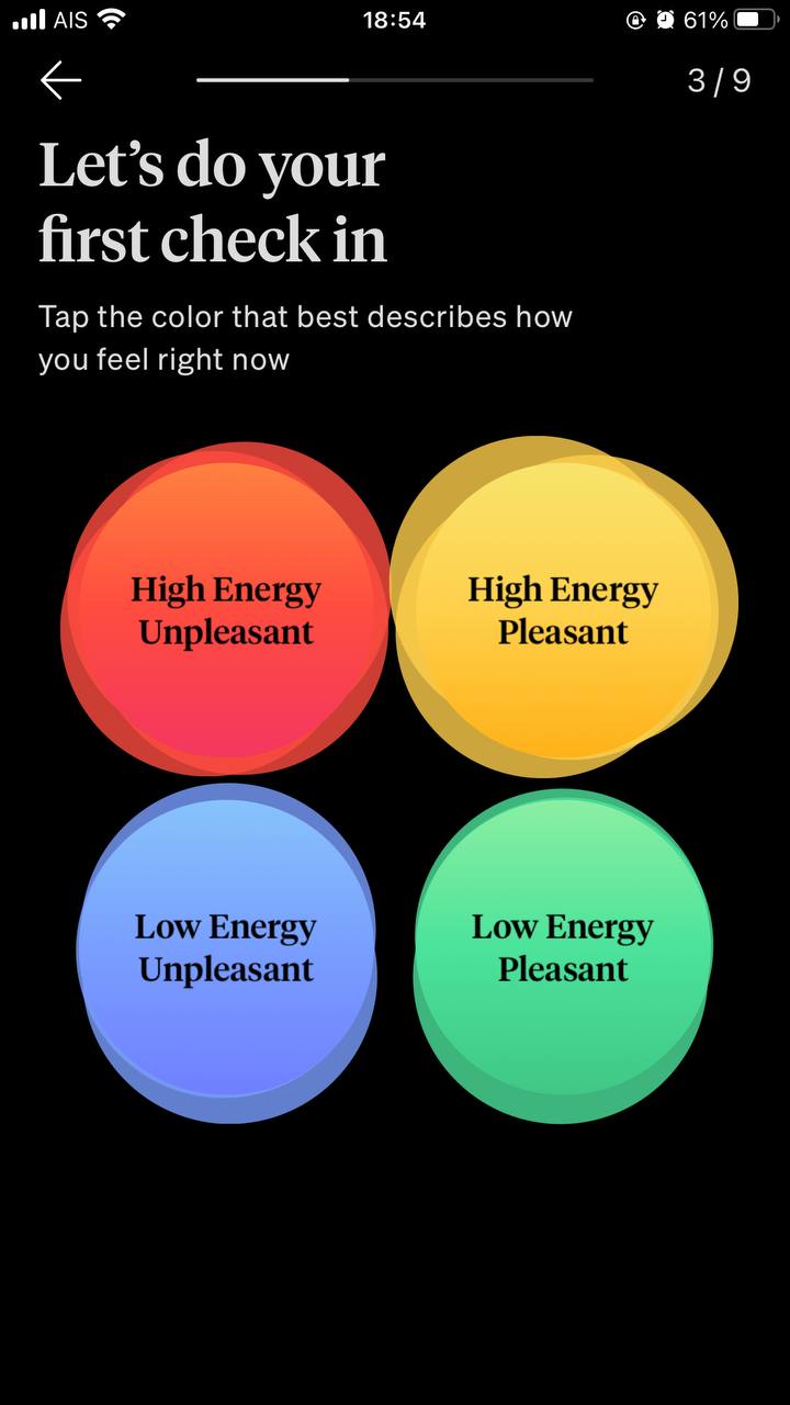 ตัวแอปเองจะพาเราไปค้นพบกลยุทธ์ในการช่วยอธิบายอารมณ์ของเราได้อย่างเหมาะสม พร้อมการติดตามอารมณ์ความรู้สึกแบบรายวัน โดยจะให้เราเลือกอารมณ์ทั้ง 4 แบบในตอนต้น คือ High Energy Unpleasant ,High Energy pleasant ,low Energy Unpleasant และ low Energy pleasant ถ้าเราเลือก พลังงานต่ำ แต่เพลิดเพลินมันจะพาเราไปทำความรู้จักอารมณ์แยกย่อยในอีกขั้นค่ะ ว่าตอนนี้เราเป็นยังไง กำลัง Chill ผ่อนคลายหรือไร้กังวล, สงบ ,ปลอดภัย เพื่อเป็นการเช็คความสำเร็จครั้งแรก!