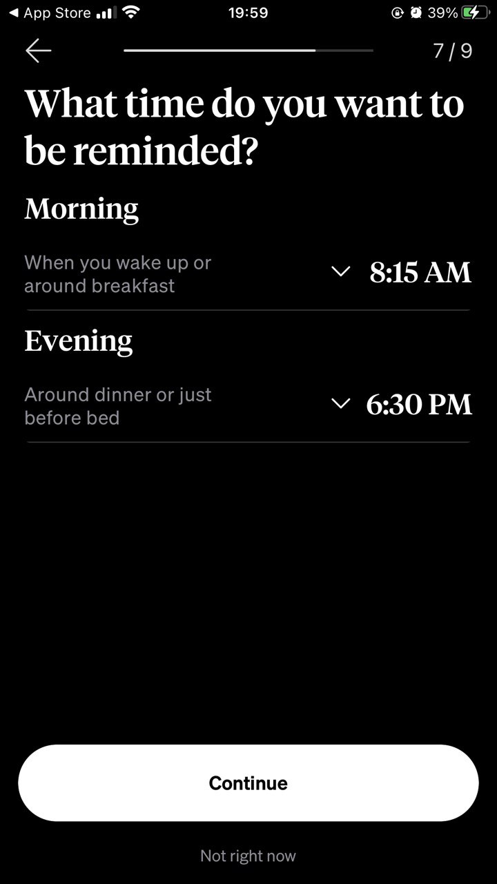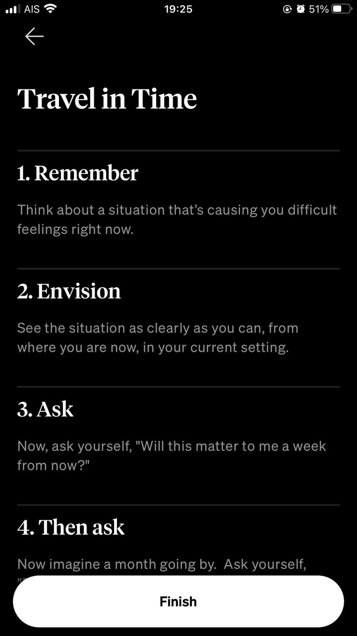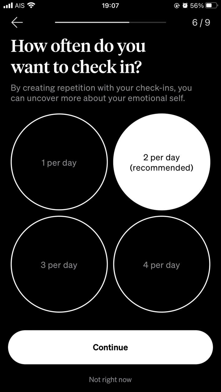 ที่สำคัญสามารถเลือกให้แจ้งเตือนได้ด้วยนะคะ ว่าอยากเช็คสัปดาห์ละกี่ครั้ง ตอนเวลากี่โมงแต่นี่ว่าคำแนะนำที่พอเหมาะ 2 ครั้งต่อสัปดาห์จะดีมาก มาถึงหน้าถัดไปเราจะพบกับผู้เชี่ยวชาญที่อธิบายเกี่ยวกับการทำงานของอารมณ์และสมองของเราว่าทำงานอย่างไร รวมไปถึงวิธีการคิดให้เรากล้าตั้งคำถามกับตัวเองมากขึ้น อย่างเช่นหน้าสุดท้ายที่มีประโยคว่า Travel in Time โดยแบ่งความเข้าใจไว้ 6 แบบ