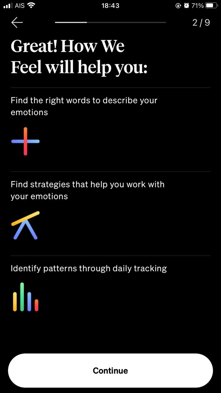 เมื่อเริ่มเข้าสู่หน้าแอป ทาง How We Feel จะให้เราตอบคำถามว่าทำไมเราถึงมาอยู่ที่ตรงนี้มีเหตุผลอะไรบ้าง เพื่อให้เข้าใจหลักการทำงานคร่าว ๆ จะมีด้วยกันได้แก่