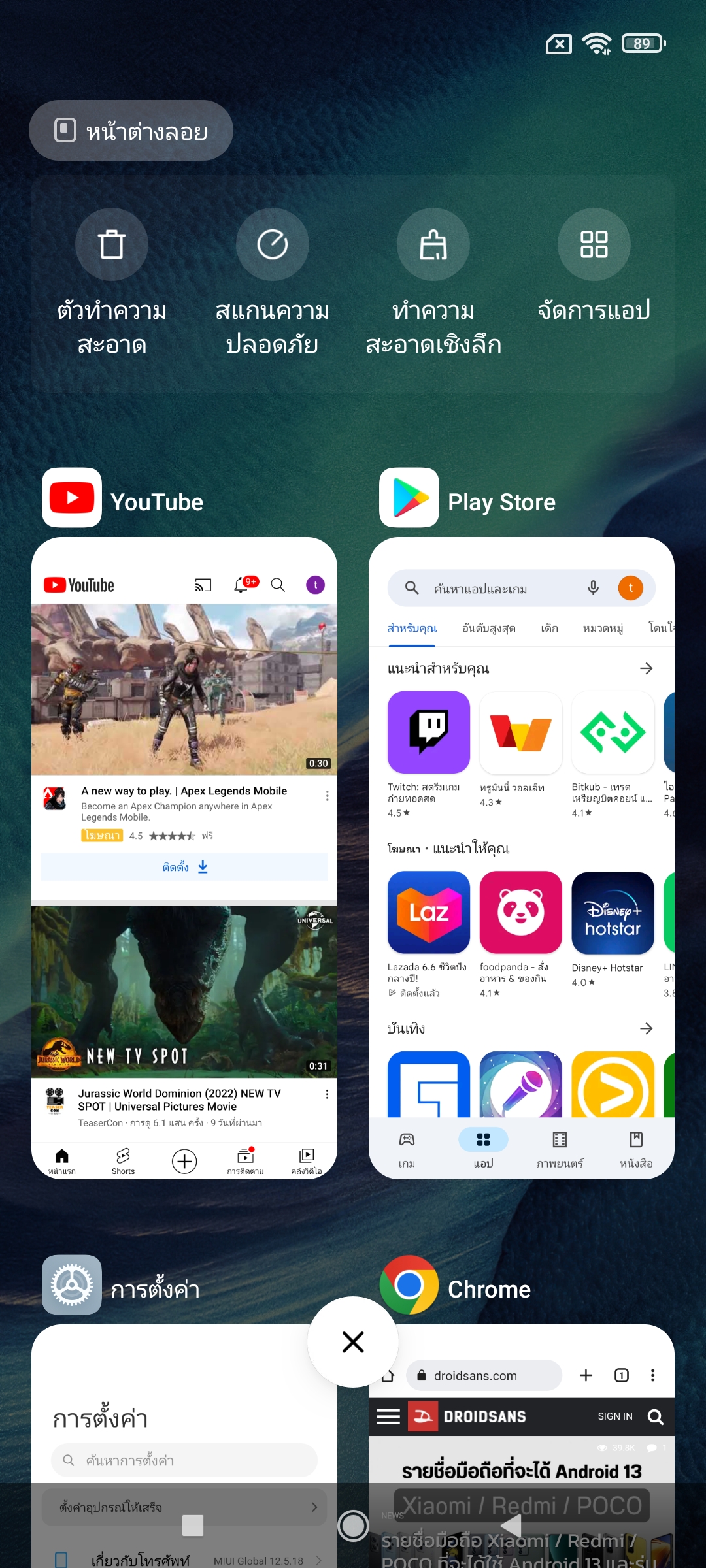 ทั้งคู่มาพร้อมระบบปฏิบัติการ Android 11 ครอบทับด้วย MIUI 12.5 เหมือนกัน แต่จะมีบางฟีเจอร์ที่ให้มาไม่เท่ากัน อาจจะเพราะว่าเป็นรุ่นเริ่มต้น เลยต้องตัดออกไปบ้าง อย่าง Game Turbo และ โหมดหน้าต่างลอย ที่มีใน Redmi 10 (2022) แต่ Redmi 10A กลับไม่มี แต่ก็เพิ่มฟีเจอร์แอปโคลนมาให้แทนครับ สิ่งที่มีเหมือนกันอีกอย่างก็คือหน้าตาการใช้งานครับ ทั้ง App drawer, Multitasking และแถบการแจ้งเตือนที่ลากลงมาจากด้านซ้ายจะเป็นศูนย์การแจ้งเตือน แต่ถ้าลากลงมาจากด้านขวาจะเป็นศูนย์ควบคุมครับ ซึ่งไม่ว่าจะรุ่นเล็กหรือรุ่นใหญ่ แม้แต่รุ่นเรือธงก็มีหน้าตาการใช้งานเหมือนกันครับ