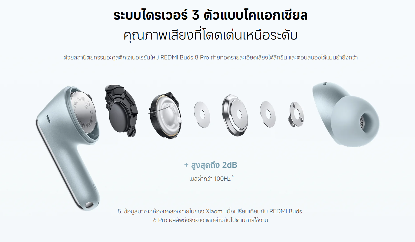 REDMI Buds 8 Pro มาพร้อมกับโครงสร้างไดรเวอร์ 3 ตัวแบบโคแอกเซียล (Coaxial Setup) ช่วยให้ถ่ายทอดรายละเอียดเสียงได้ดีขึ้นกว่าเดิม มิติเสียงและย่านเบสมีมิติมากขึ้น โดยที่ได้รับการปรับจูนเป็นพิเศษโดย Dolby Audio เสริมเรื่องเสียงสนทนาที่คมชัด