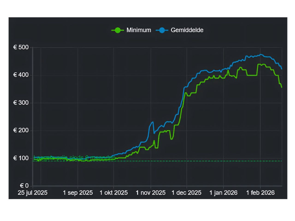 ข้อมูลกราฟราคาที่ถูกเผยแพร่ในคอมมูนิตี้สายพีซีชื่อดัง แสดงให้เห็นแนวโน้มราคาชุดแรม DDR5 ขนาด 32GB โดยเฉลี่ยในสหภาพยุโรป ตั้งแต่ช่วงปลายเดือนกรกฎาคม 2025 ถึงกุมภาพันธ์ 2026 ในช่วงแรก ราคาทรงตัวอยู่ที่ราว 95-100 ยูโร ก่อนจะเริ่มขยับขึ้นในเดือนตุลาคม และเร่งตัวแรงในเดือนพฤศจิกายน จนทำจุดสูงสุดในช่วงต้นเดือนกุมภาพันธ์ 2026 ที่ระดับประมาณ 430-470 ยูโร หรือราว 16,000-17,500 บาท นับเป็นการปรับขึ้นหลายเท่าตัวภายในเวลาไม่ถึงครึ่งปี