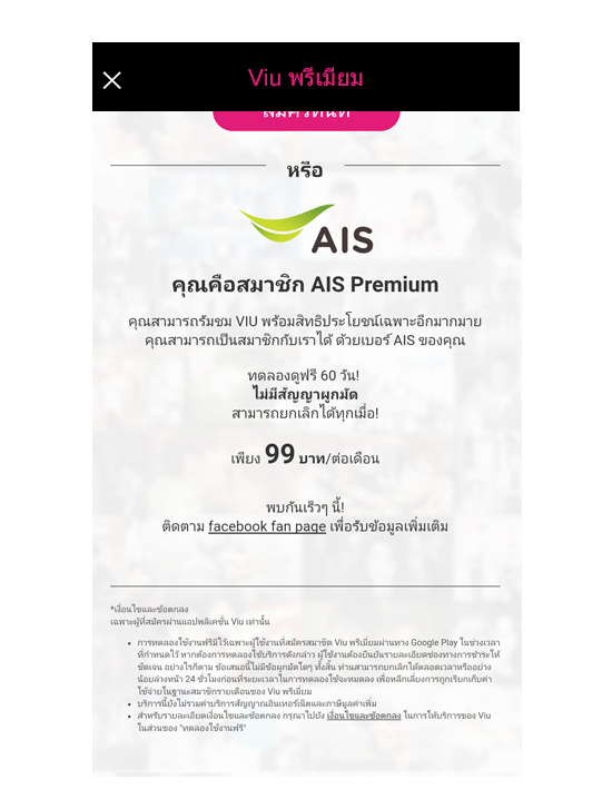 แต่ก่อนหน้านี้ Viu ได้โปรโมทคู่กับ AIS เมื่อช่วงกลางๆเดือน โดยให้สิทธิพิเศษกับลูกค้า AIS ถ้าใครสมัครสมาชิกในช่วงนั้น จะได้เป็นสมาชิกแบบพรีเมี่ยมเป็นเวลา 15 วันแรกหลังจาก นำโค้ดที่ได้รับจากการสมัครมาใส่ในเว็บค่ะ(จิ้มลิ้งค์ใน sms ได้เลย)