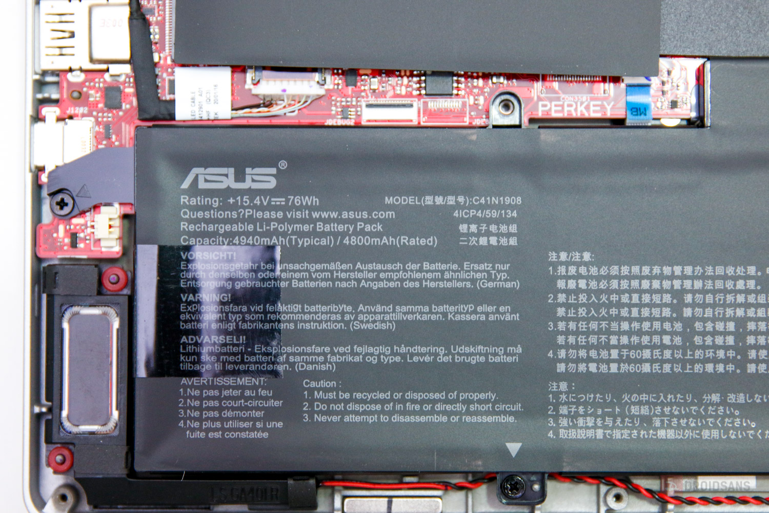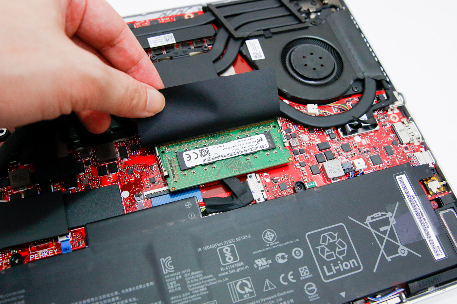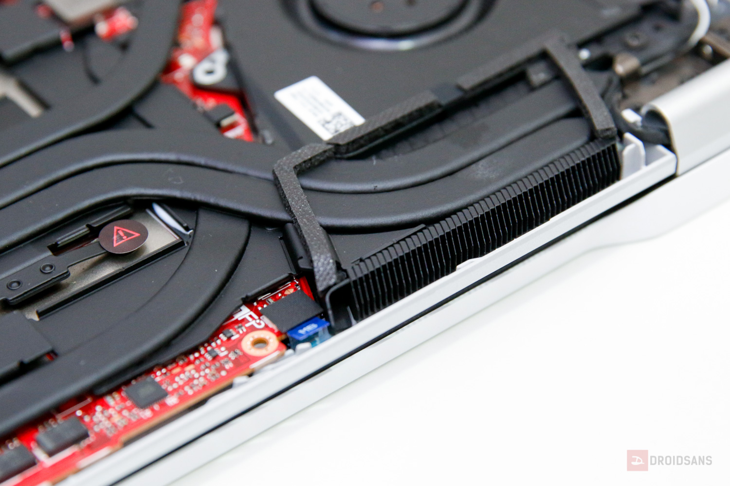 เมนบอร์ดภายในตัวเครื่องจะเป็นสีแดง ประกอบกับไปด้วยพัดลม 2 ตัว ฮีทไปป์ 6 เส้น ช่องระบายความร้อน 4 ช่อง (หลัง 2 ช่อง และด้านข้างอย่างละ 1) แบตใหญ่ยาววางเต็มเครื่อง ทำให้การวางบาลานซ์ตัวเครื่องค่อนข้างดี ส่วนการอัปเกรดตัวเครื่องจะมี Ram 1 Slot และมี SSD m.2 อีก 1 ช่องด้วยกัน ซึ่งหากจะอัปเกรดก็คือต้องถอดอันเก่าออกก่อน