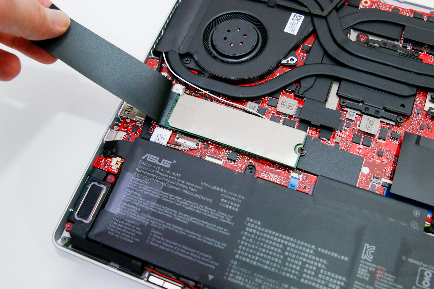 ในส่วนของการอัปเกรดตัวเครื่อง ASUS ROG Zephyrus G14 ส่วนตัวถือว่าทำได้ค่อนข้างง่ายไม่ยากเท่าไร เพียงแต่ว่าน็อตตัวเครื่องจะเยอะไปหน่อยต้องจำดีๆ ว่าตัวไหนอยู่ตรงไหน โดยอุปกรณ์ที่ใช้จะมีไขควง 4 แฉกกับอันบัตรแข็งๆ อีก 1 ใบ ซึ่งตัวเครื่องออกแบบมาค่อนข้างดีคือน็อตตัวล่างขวาสุดเมื่อเราคลายออกจะช่วยยกฝาตัวเครื่องขึ้นมาด้วย ทำให้เราแกะฝาหลังออกง่ายขึ้นนั่นเอง
