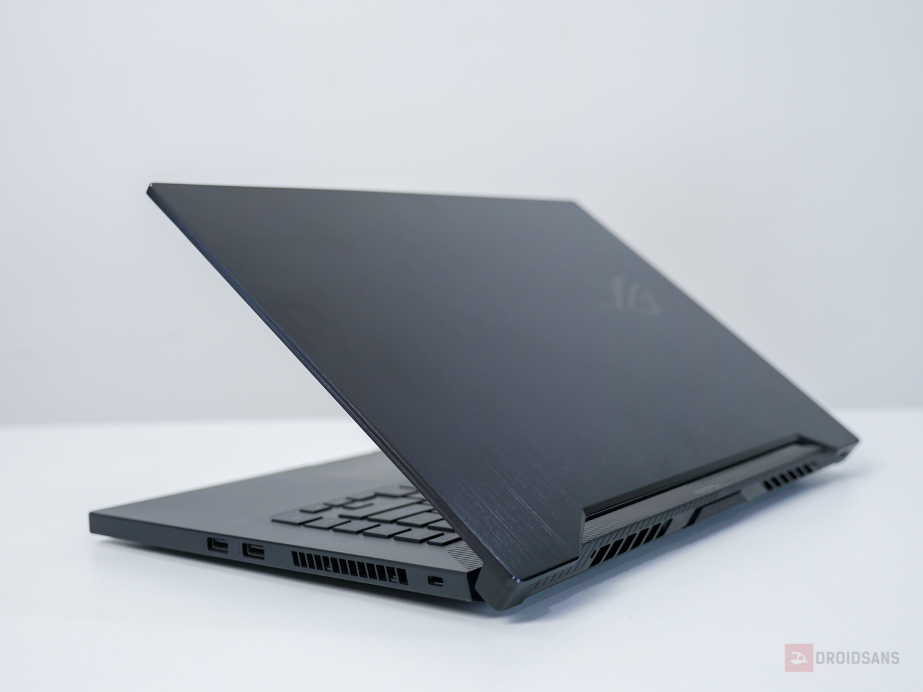 ฝาหลังตัวเครื่องก็จะเป็นลวดลายเส้นแนวทแยง พร้อมกับลายปัดเสี้ยนสลับไปมา ส่วนโลโก้ ROG จะอยู่ที่ด้านฝั่งขวาตามปกติ ไม่มีไฟ ซึ่งตัวฝาหลังจะตัดกรอบด้านล่างไปทรง V-Sharp เว้นไว้แสดงไฟสถานะของตัวเครื่อง