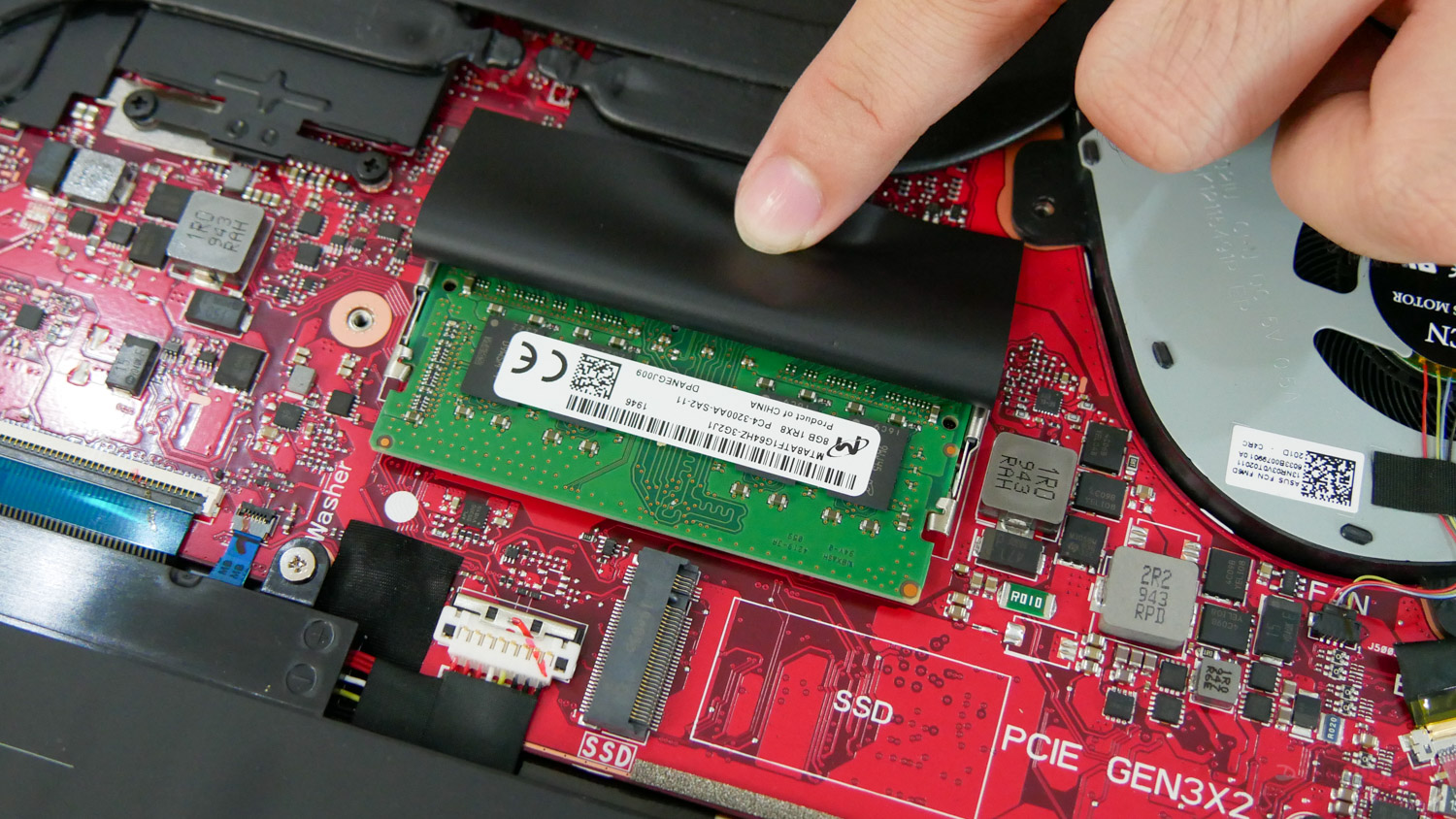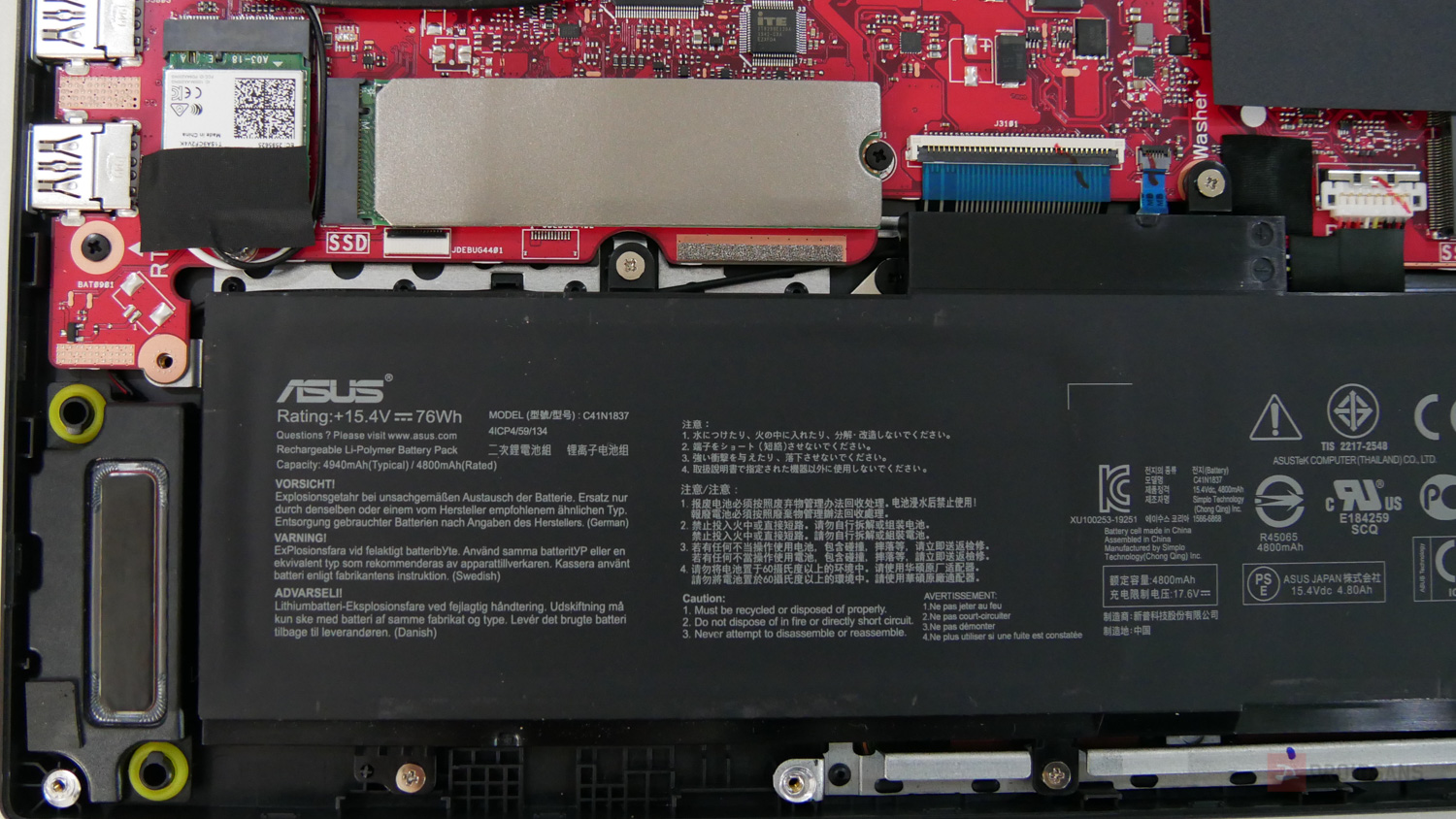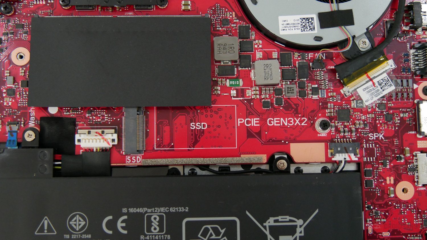 ภายในตัวเครื่องจะเห็นเมนบอร์ดสีแดงสุดจี๊ด พร้อมกับพัดลมระบายความร้อน 2 ตัว ฮีทไปป์ 4 เส้น การอัปเกรดสามารถใส่ SSD m.2 PCIe ได้อีก 1 ช่อง ส่วน Ram จะเป็นแบบฝังบอร์ดมาแล้ว 8GB ถอดเปลี่ยนได้เองอีก 1 ช่องด้วยกัน และตัวเครื่องไม่สามารถใส่ SSD หรือ HDD 2.5 เพิ่มได้